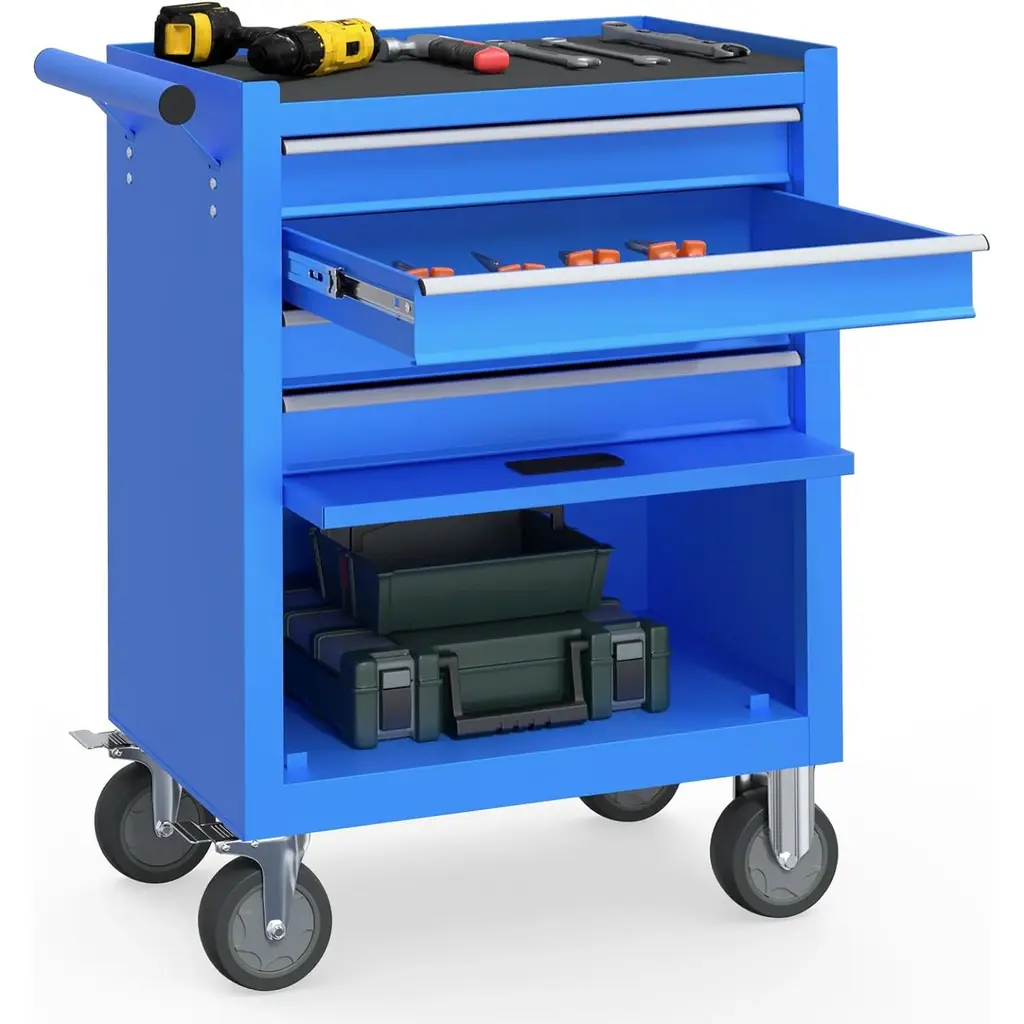 This heavy-duty, modern tool cart is built for superior storage and mobility in garages, workshops, or warehouses. Its ultra-durable, scratch-resistant construction supports bulk storage while remaining easy to move. Features include locking security and smooth-rolling wheels.
