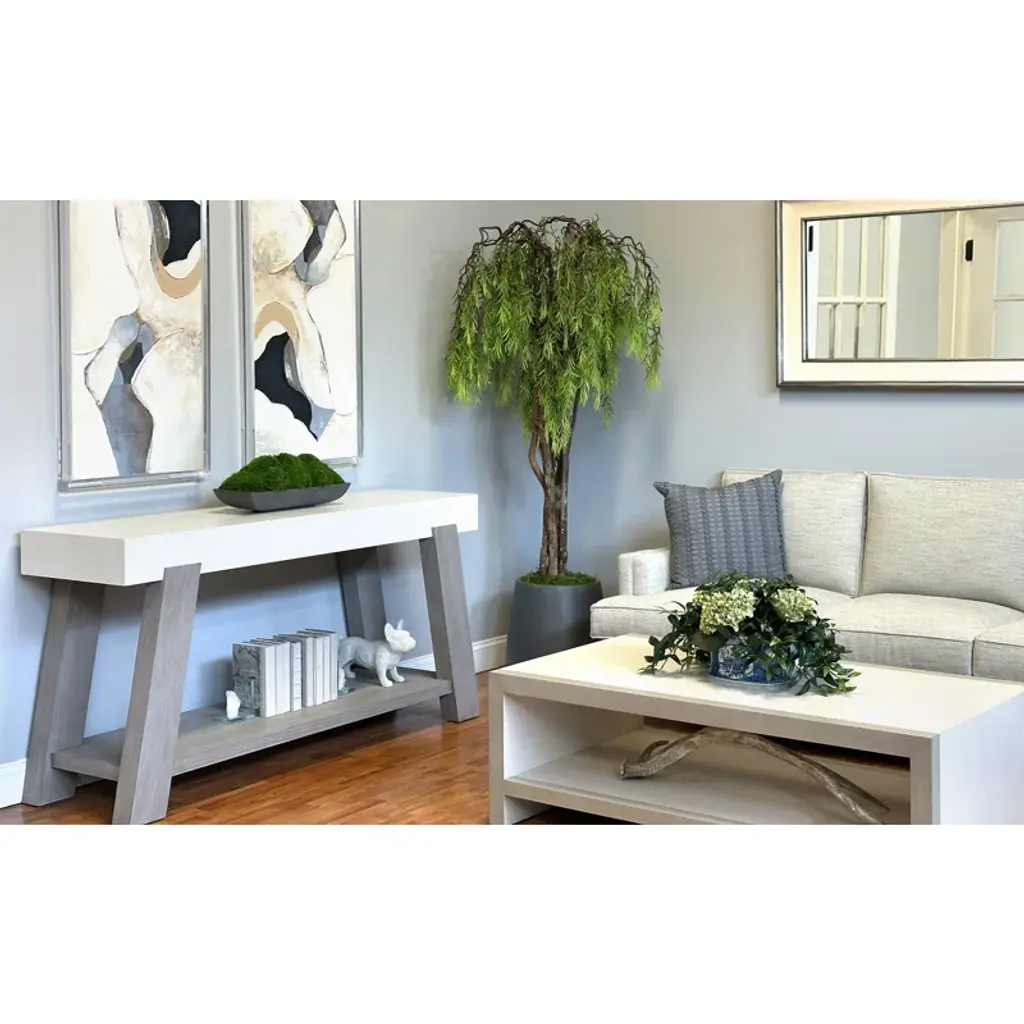 Bring a touch of outdoors into your home with our lush hydrangea arrangement. Our floral is arranged in blue and white ceramic vase. Lush with lifelike detail, this natural look arrangement is designed with colors inspired by nature. Our arrangement will complement any room in your home or office.