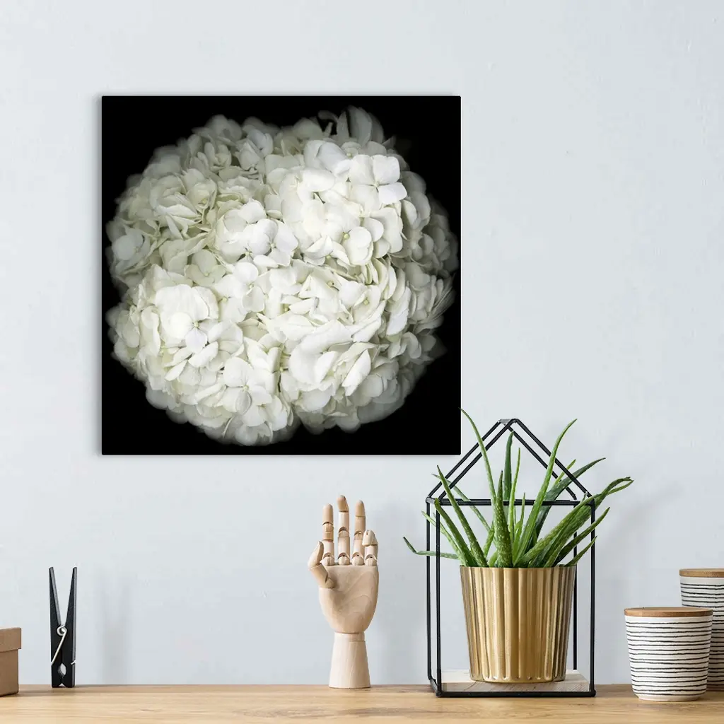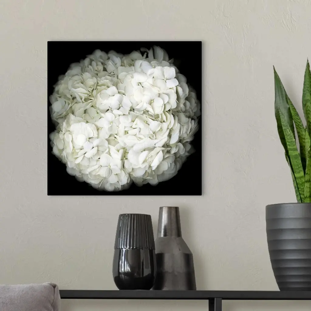 Square photograph of a white Hydrangea close-up on a dark black background.