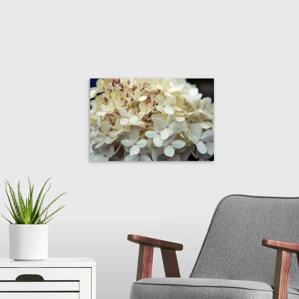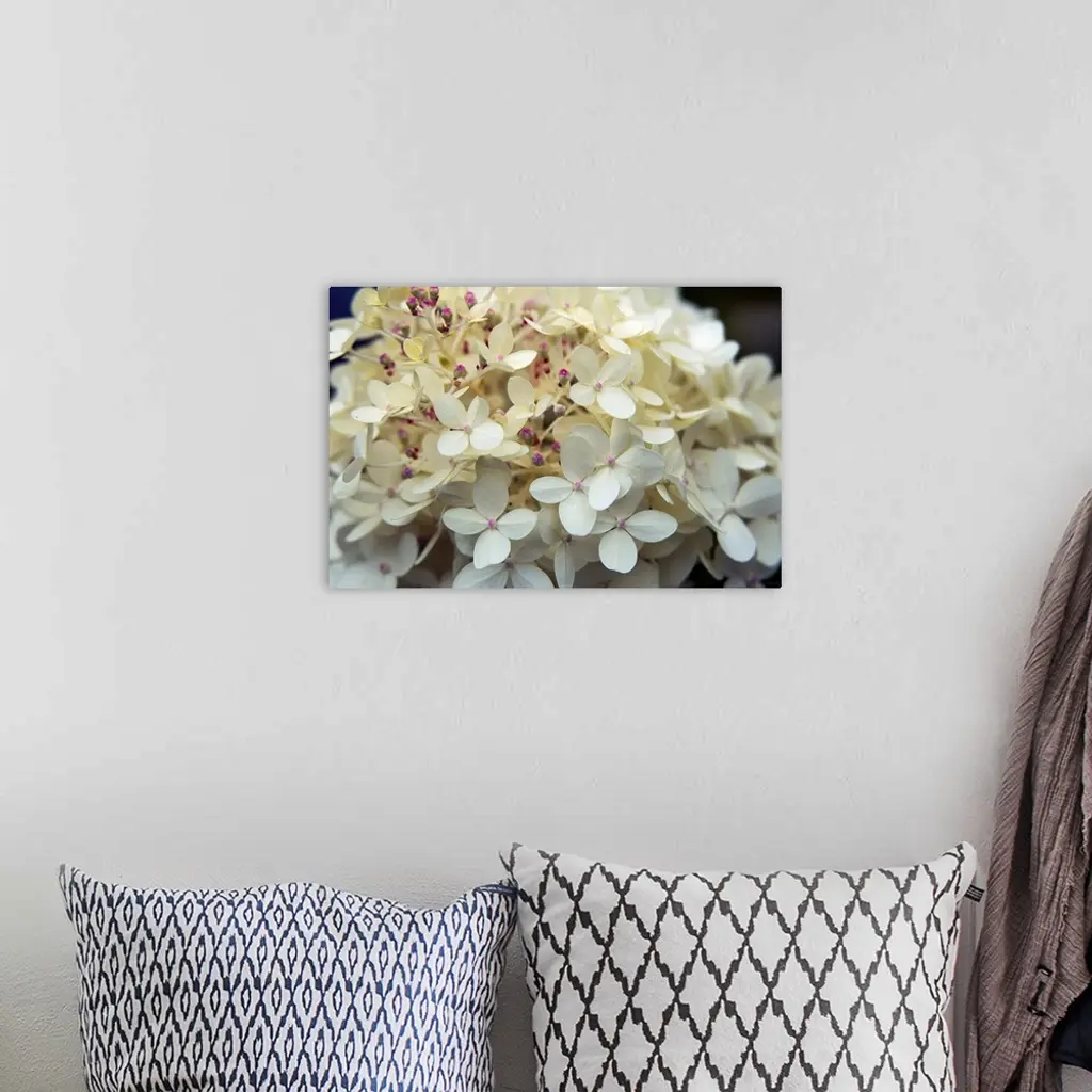 Photograph of white hydrangeas up-close with pink buds and a shallow depth of field.