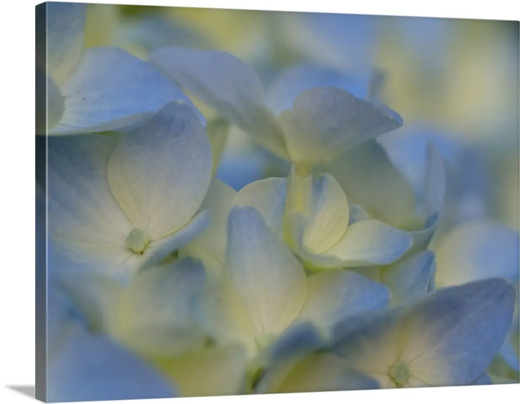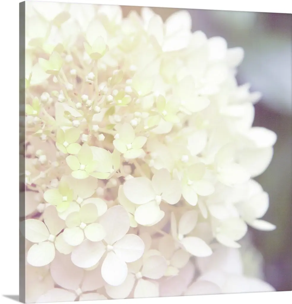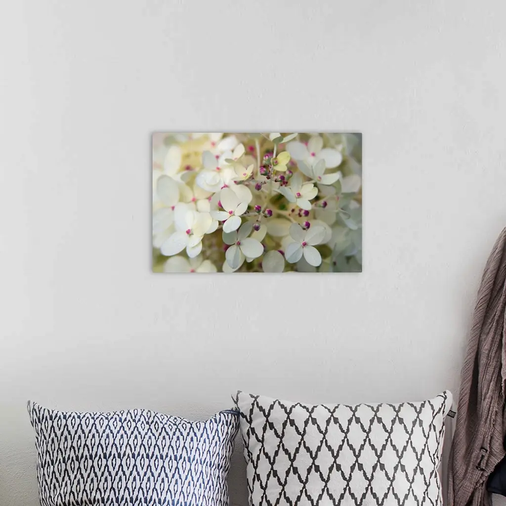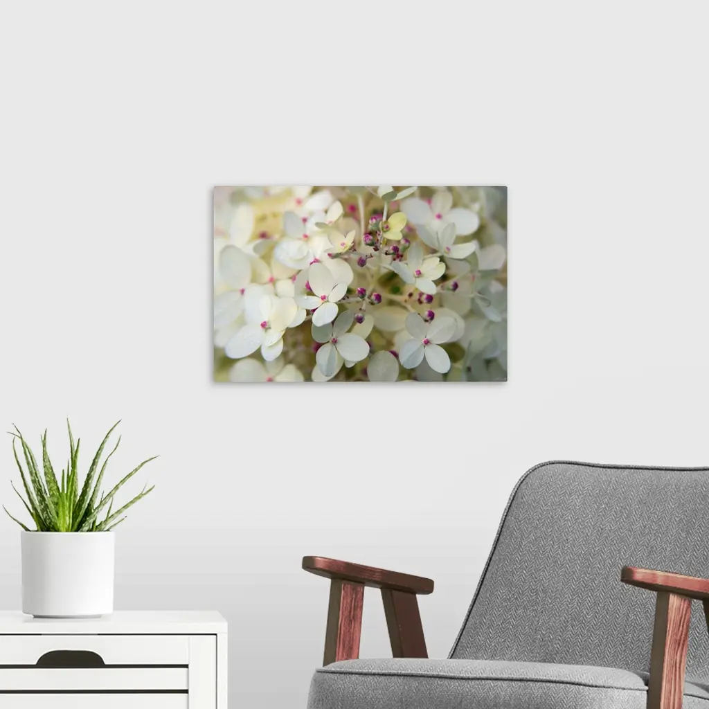Photograph of white hydrangeas up-close with pink buds and a shallow depth of field.