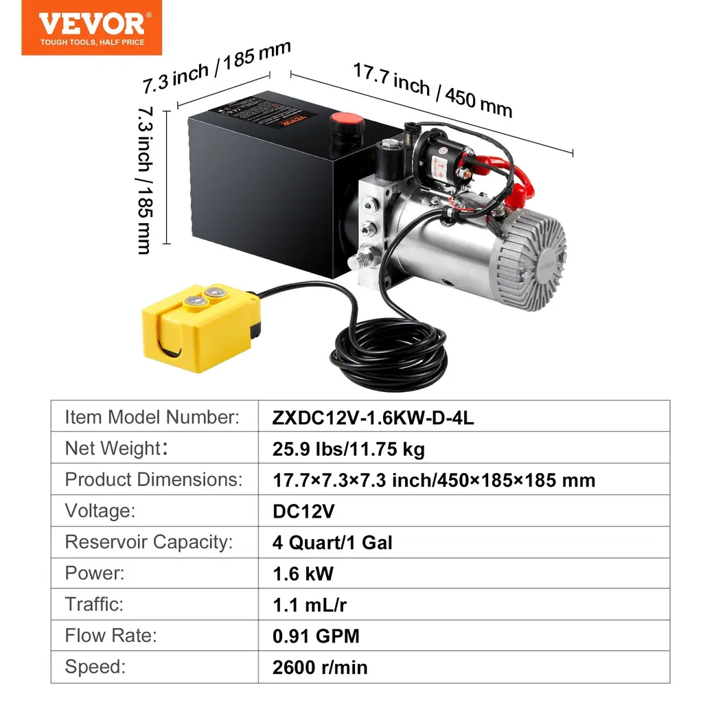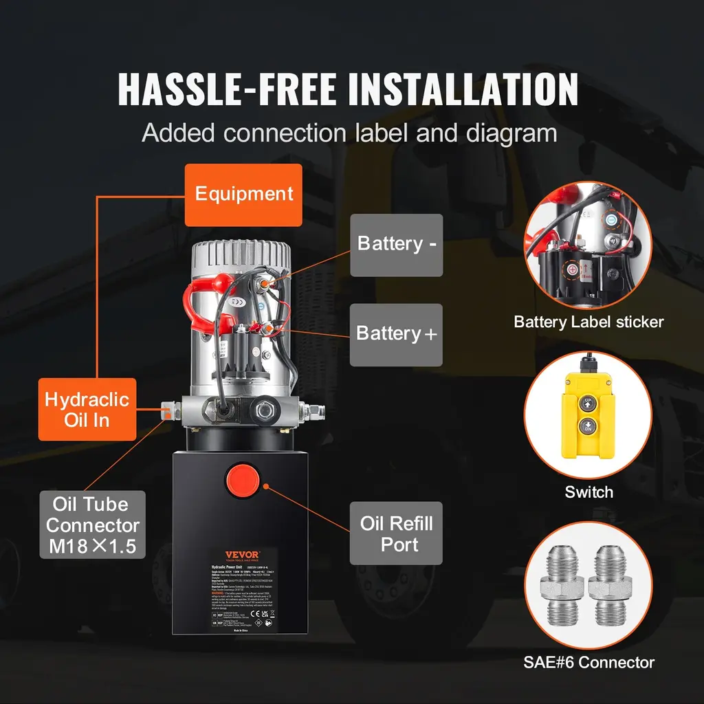 High-Powered Performance: Our hydraulic pump adopts a 12V, 1.6kW DC motor, delivering a high flow rate of up to 0.91GPM. With a 15/6/8/4/10/12/20-quart tank and 16-20Mpa oil pressure, this powerhouse releases a maximum pressure of 3200 psi; the dump trailer pump can effortlessly handle heavy vehicles and machinery, lifting them with ease. Experience the power! Precision Double-Action Lifting: Designed for accuracy, our hydraulic power unit employs a double-action power mechanism. Ensures hydraulic oil works alternately in both ports, evenly distributing force across your equipment. A built-in safety relief valve automatically releases pressure if the limit is exceeded, ensuring a safer operation with fewer failures. Hassle-free Setup: The 12V hydraulic pump arrives pre-assembled. Add hydraulic oil and connect the power supply and tubing, and you're ready to start.Hydraulic pump includes SAE#6 converter, making it compatible with metric and American interfaces for your convenience. Built to Last: Our hydraulic pump is built tough. It boasts robust overall sealing, minimizing the risk of oil leaks. The rust-proof solid metal steel tank ensures durability, even in high-impact situations and daily use. It's engineered to withstand the rigors of installation on heavy equipment. Versatile Applications: This double-acting hydraulic pump isn't limited to one task. It's a versatile workhorse, suitable for various lifting and stamping applications. From dump trailers and container truck tailplates to hydraulic wood splitters, small presses, lifting platforms, semi-electric push trucks, bucket transporters, and more. Package Content 1 x Hydraulic Pump 1 x SAE#6 Converter(2x SAE#6 Converter)
