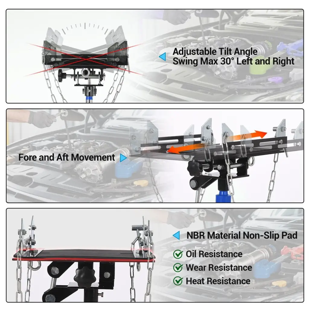 Introducing the Hydraulic Transmission Jack, a powerful and versatile tool designed to make vehicle maintenance and repair easier and safer. With a robust lifting capacity of 1322 lbs, this adjustable telescoping jack offers a height range from 33.8 inches to 72.8 inches, allowing you to handle various transmission sizes and vehicle types with ease. Its double column design provides enhanced stability and durability, ensuring reliable performance during heavy-duty lifting tasks.Equipped with a convenient foot pedal, this hydraulic jack allows for hands-free operation, improving efficiency and safety in your garage or workshop. The 360-degree swivel wheels offer exceptional maneuverability, enabling smooth and precise positioning under your vehicle without the need for excessive effort.Crafted with high-quality materials, this red hydraulic transmission jack combines strength and longevity, making it anaddition to any car lift or garage floor setup. Its telescopic lift feature ensures adjustable height settings, catering to different repair needs and vehicle heights.Key Features:- Heavy-duty hydraulic transmission jack with 1322 lbs lifting capacity- Adjustable telescoping height from 33.8" to 72.8" for versatile use- Double column design for enhanced stability and durability- Foot pedal operation for hands-free lifting convenience- 360-degree swivel wheels for easy maneuverability- Ideal for car lifts, garage floors, and professional automotive use- Durable red finish for long-lasting performance and visibilityUpgrade your automotive repair tools with this reliable hydraulic transmission jack. Whether you're a professional mechanic or a car enthusiast, this jack provides the power, precision, and safety you need to perform transmission lifts and other heavy lifting tasks efficiently. Experience smooth operation and robust support with thisgarage floor jack.