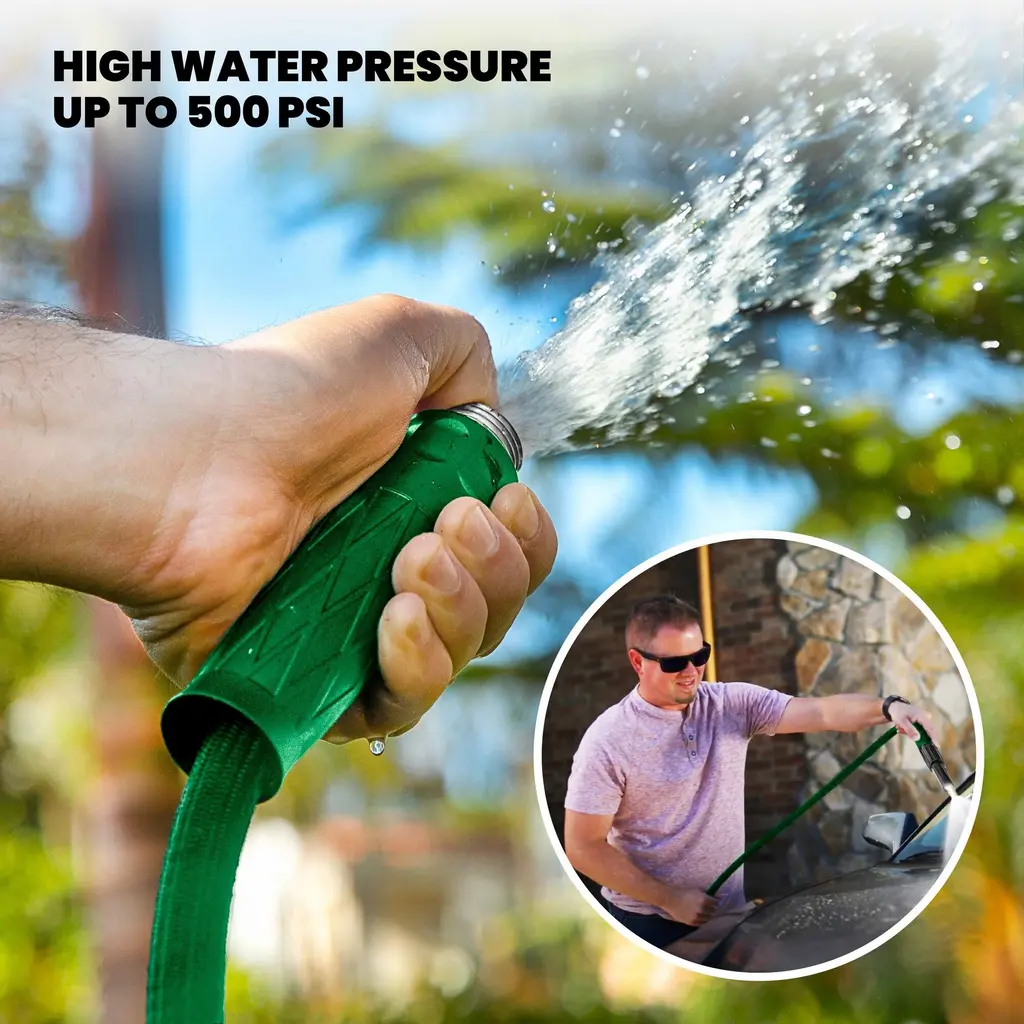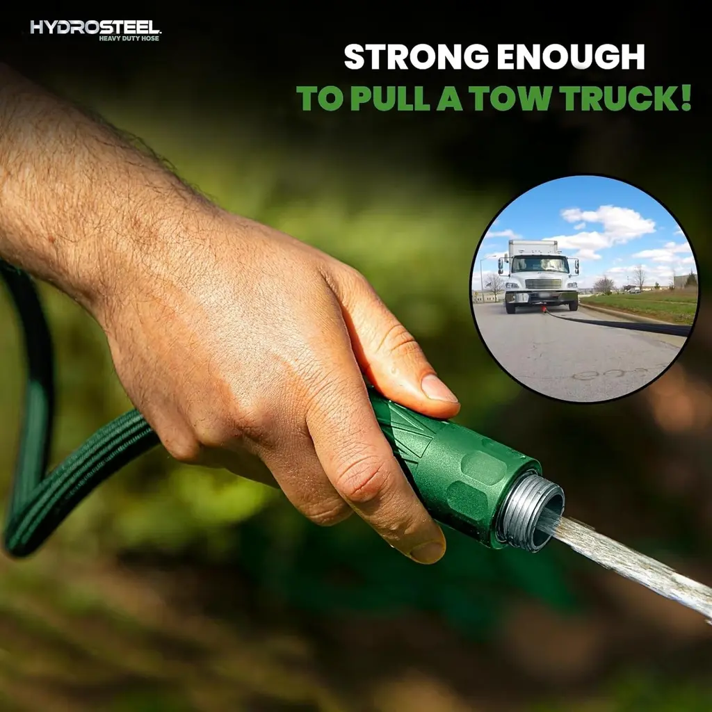 Discover premium durability with the Hydrosteel Heavy Duty Steel Garden Hose. Designed with ultra-durable rubber, 304 stainless steel, and tear-resistant material, this hose withstands high-pressure use up to 500 PSI without kinking. Lightweight and weather-resistant, it connects seamlessly to any nozzle and features heavy-duty aluminum fittings. Perfect for homeowners seeking a reliable, high-performance solution for gardening, outdoor cleaning, or general water use. Key Features: High-Pressure Performance: Engineered to handle up to 500 PSI, this steel garden hose delivers exceptional water flow for heavy-duty tasks, from gardening to outdoor cleaning. Three-Layer Durability: Built with ultra-durable rubber, 304 stainless steel, and tear-resistant material, ensuring long-lasting strength and resistance to damage in all weather conditions. Kink-Resistant Design: Designed to resist kinking and tangling, offering seamless water flow and reducing frustration during use. Lightweight and Easy to Use: Lightweight construction makes it easy to maneuver and connect to any nozzle, ensuring hassle-free handling for homeowners of all experience levels. Weather-Resistant Construction: Built to withstand various weather conditions, this garden hose performs reliably in both high heat and freezing temperatures, making it an all-season essential. Garden Hose Length Option: Available in 100 / 50 ft sizes, providing flexibility to suit different outdoor watering needs.