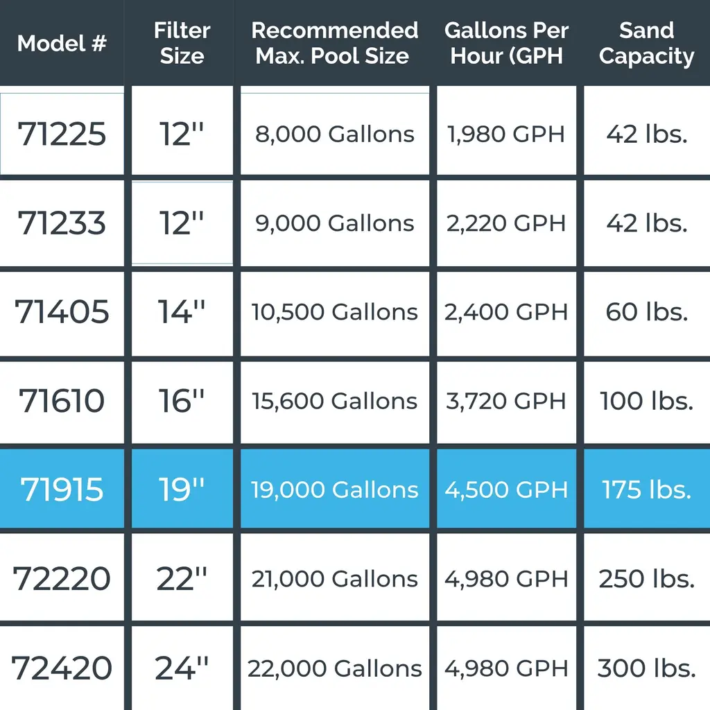 Take the toil and frustration of pool cleaning out of your routine this summer. Spend more time enjoying your pool and less time cleaning it with the HYDROTOOLS by Swimline Sand Filter Combo. This sand filter is meticulously designed to efficiently and consistently filter your pool while optimally conserving energy and complying with new DOE compliance and regulations. The filter is constructed to promote the cleanest water quality while providing a quick and simple user experience. Carefully molded, the tank is double-reinforced to ensure a reliable, air-tight compartment for filtration action. Sand can withstand approximately 5 years of use before replacement depending on water chemistry and proper backwashing frequency. Sand is not included. The pumps housed by this sand filter combo system run on low noise levels, creating a fantastic user experience. Components include a tank, pump, filter base, multi-port valve, 3-prong plug, power cord, and more. Spend less time worrying about maintaining your pool, and more time enjoying it with this Sand Filter Set - the Hydrotools' goal is to help you achieve more quality time on the water with friends and family. Sand filter designed to hold sand at the most efficient position for optimized filtration, consistent performance, and efficient backwashing Double-reinforced 12-inch molded tank can hold up to 42 pounds of sand, perfect for pools up to 8,000 gallons; Sand not included Features 0.3 THP with 1,980 gallons per hour capacity pump that brings efficiency to your cleaning; Compliant with new DOE regulations Optimized to run on low noise levels, making the filtration process a seamless experience for pool owners Comes with everything you need out of the box for quick, simple setup and operation: tank, pump, filter base, 4-way multi-port valve, 3-prong plug, power cord, and more Integrated multi-port valve provides quick, easy-to-understand settings for optimal filtration performance; Backwash, rinse, filtration, and winter Works perfectly with Hydrotools products but also as plug & play replacements for other brand pool equipment Capacity: 8,000 Gallons Color: Blue Dimensions (L x W x H): 23.5 x 18.5 x 13 inches Weight: 23 pounds Manufacturer warranty: 1-year warranty