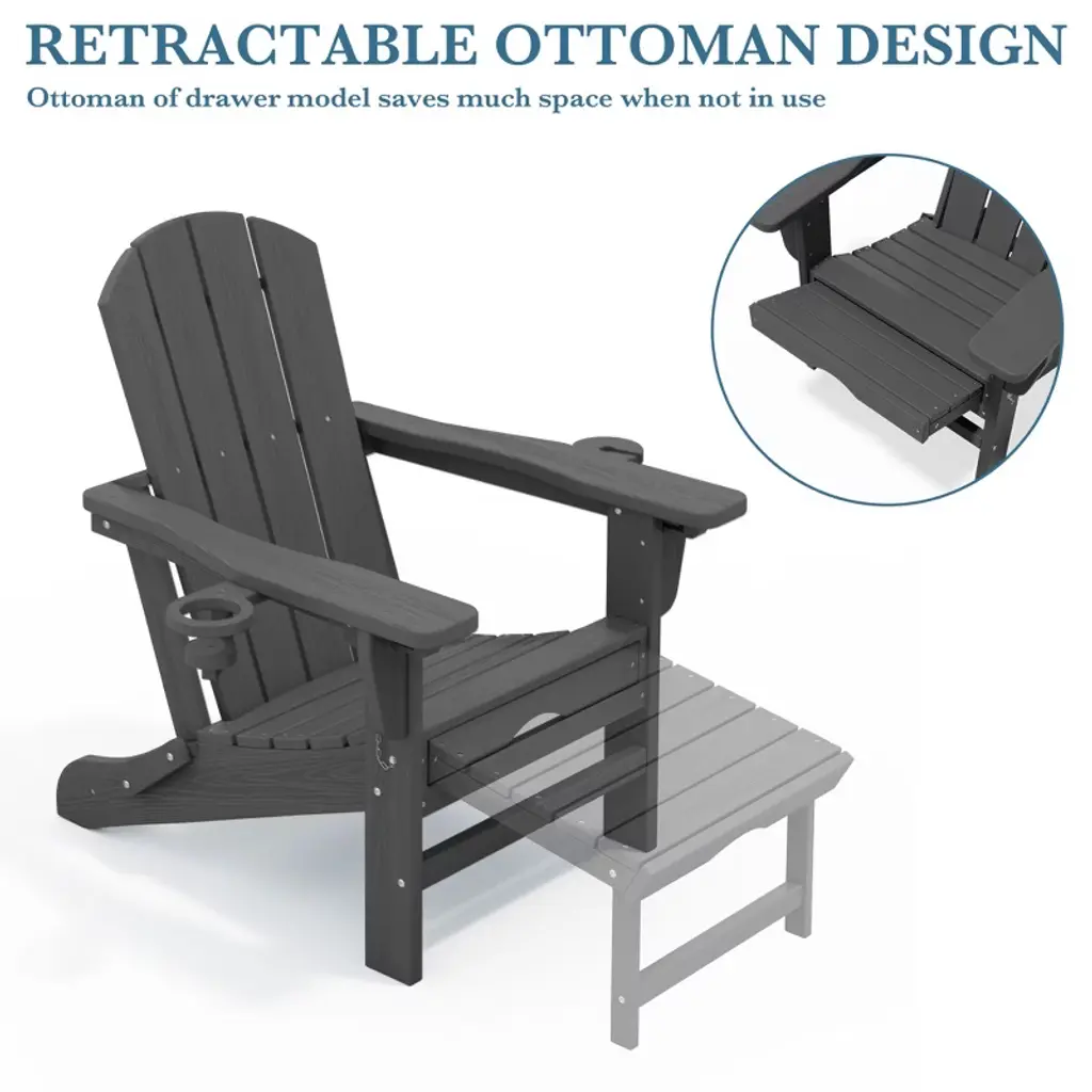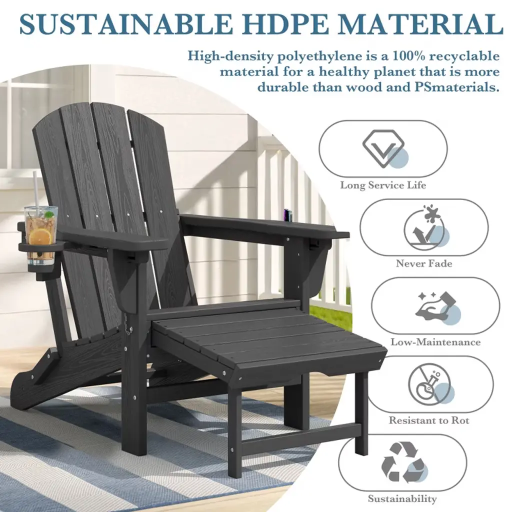 Experience ultimate relaxation with our 3-Level Adjustable Patio Accent Chair, featuring a retractable ottoman for extended comfort. Made from durable HDPE material, this chair is designed to withstand various weather conditions while providing a stylish addition to your outdoor space. Enjoy your favorite beverages and stay connected with our convenient cup and phone holders. Whether you're lounging by the pool, in your garden, or on your balcony, this chair offers the perfect blend of comfort and functionality.