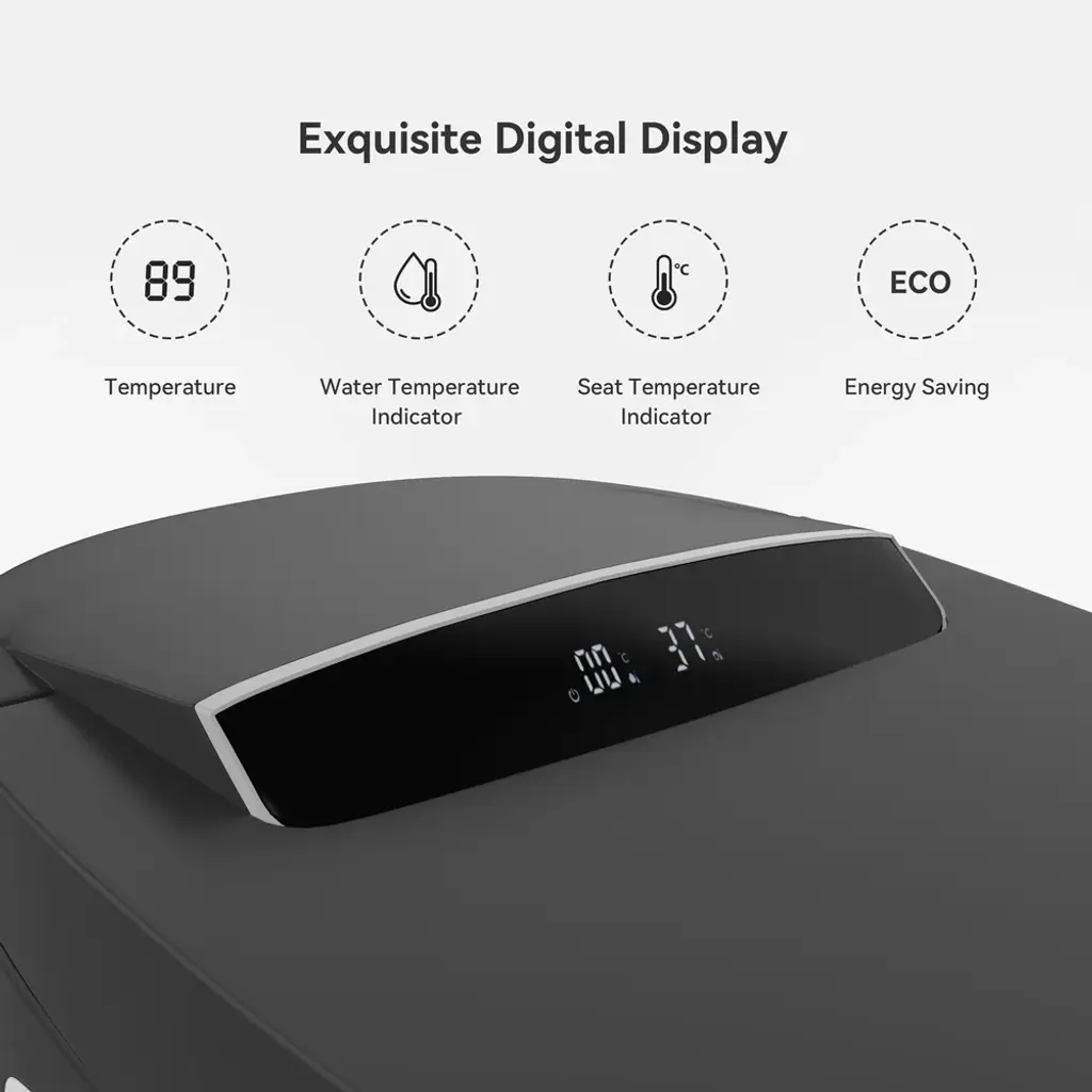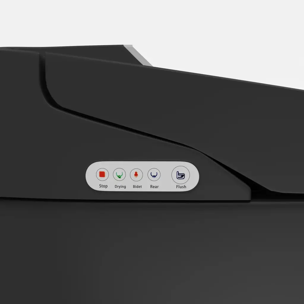 Minimalist modern design: black elongated smart toilet, clean, sleek look and compliment with different styles like modern, craftsman, traditional and etc.