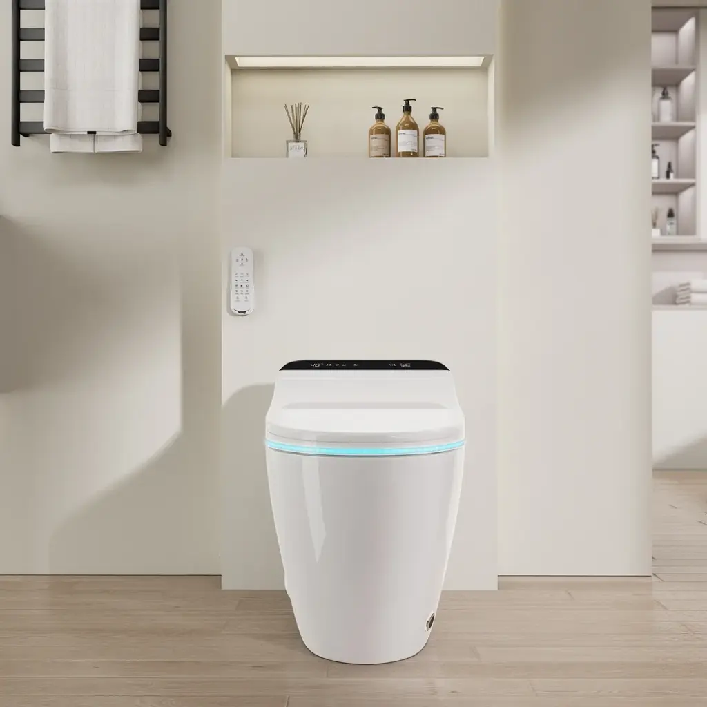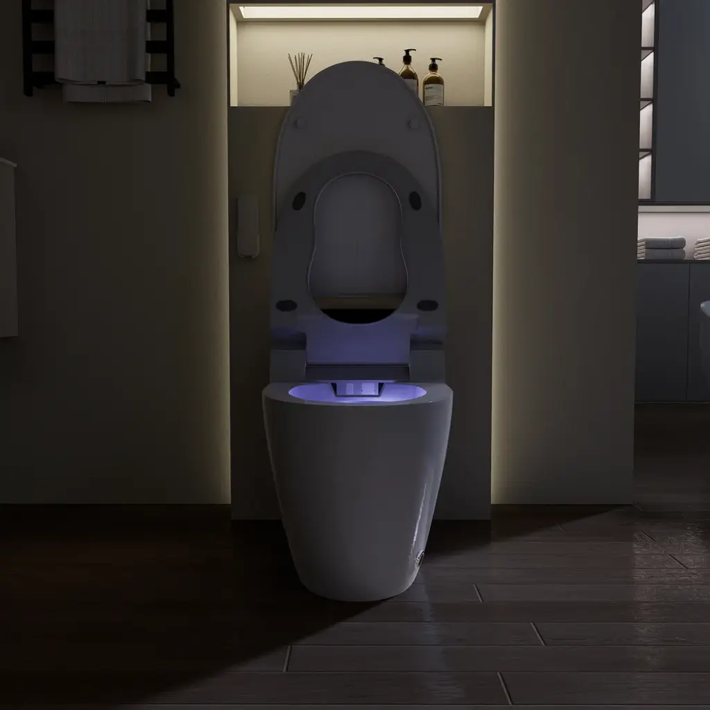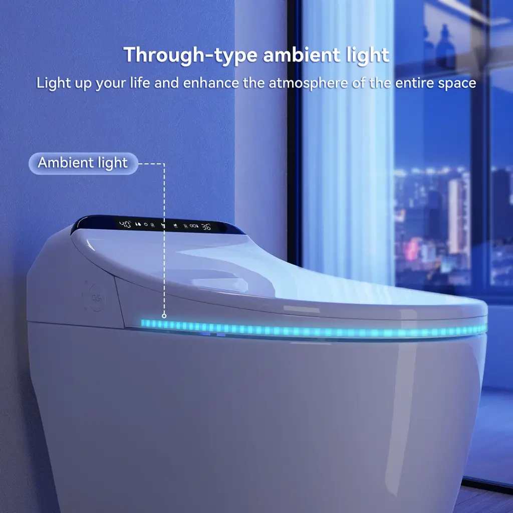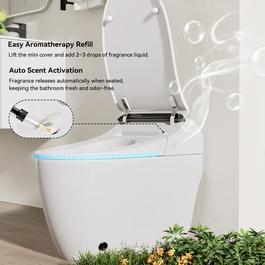 Elevate your bathroom with our Automatic Smart Bidet Toilet featuring vibrant color ambient lighting and aromatherapy. Enjoy auto open lid, heated seat, and adjustable nozzle wash. The LED display and warm air dryer complete this high-tech experience.