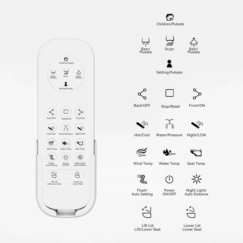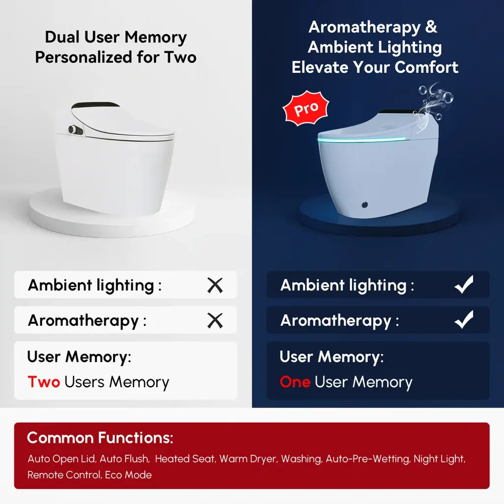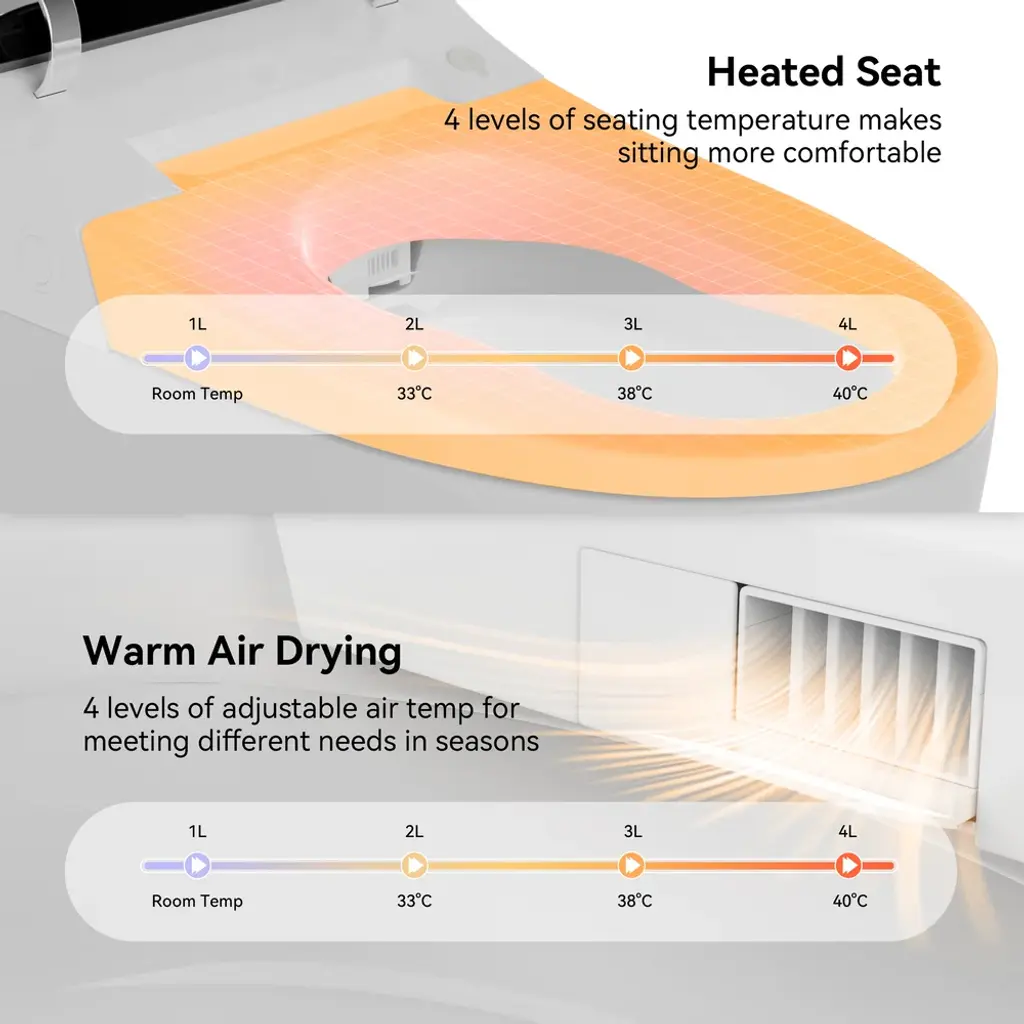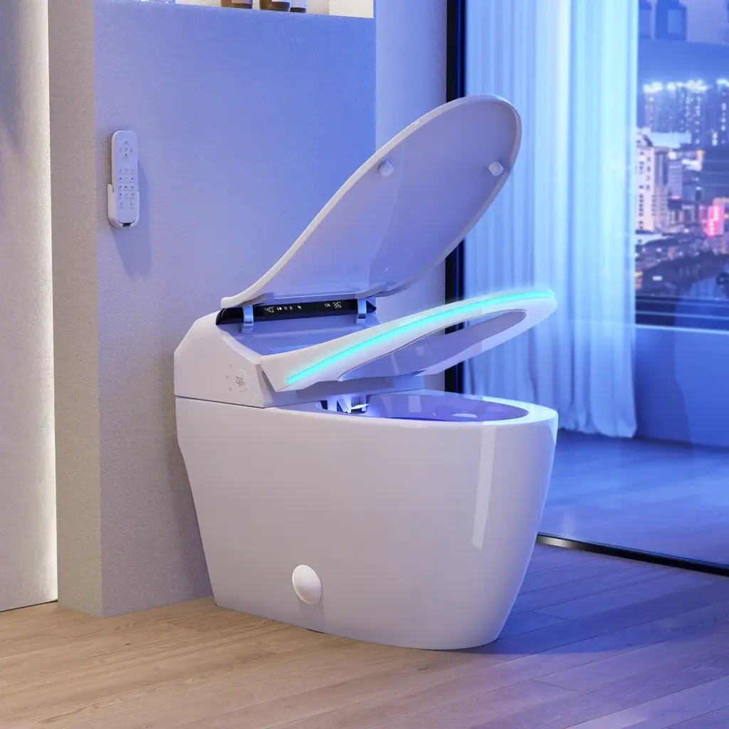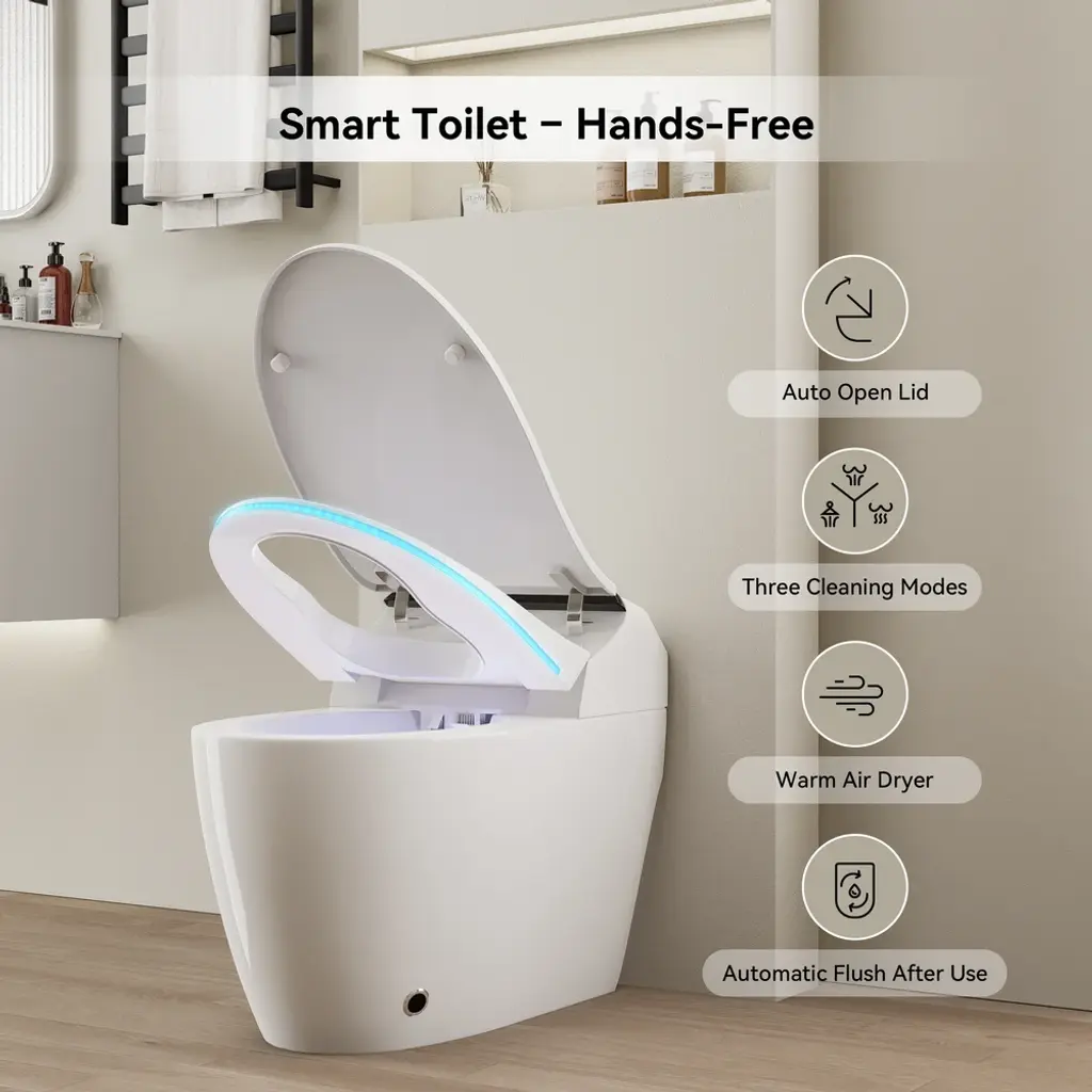 Elevate your bathroom with our Automatic Smart Bidet Toilet featuring vibrant color ambient lighting and aromatherapy. Enjoy auto open lid, heated seat, and adjustable nozzle wash. The LED display and warm air dryer complete this high-tech experience.