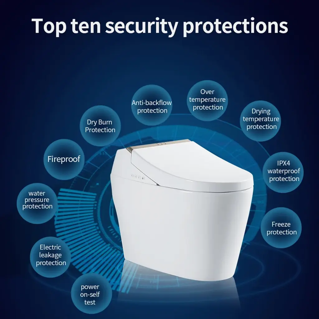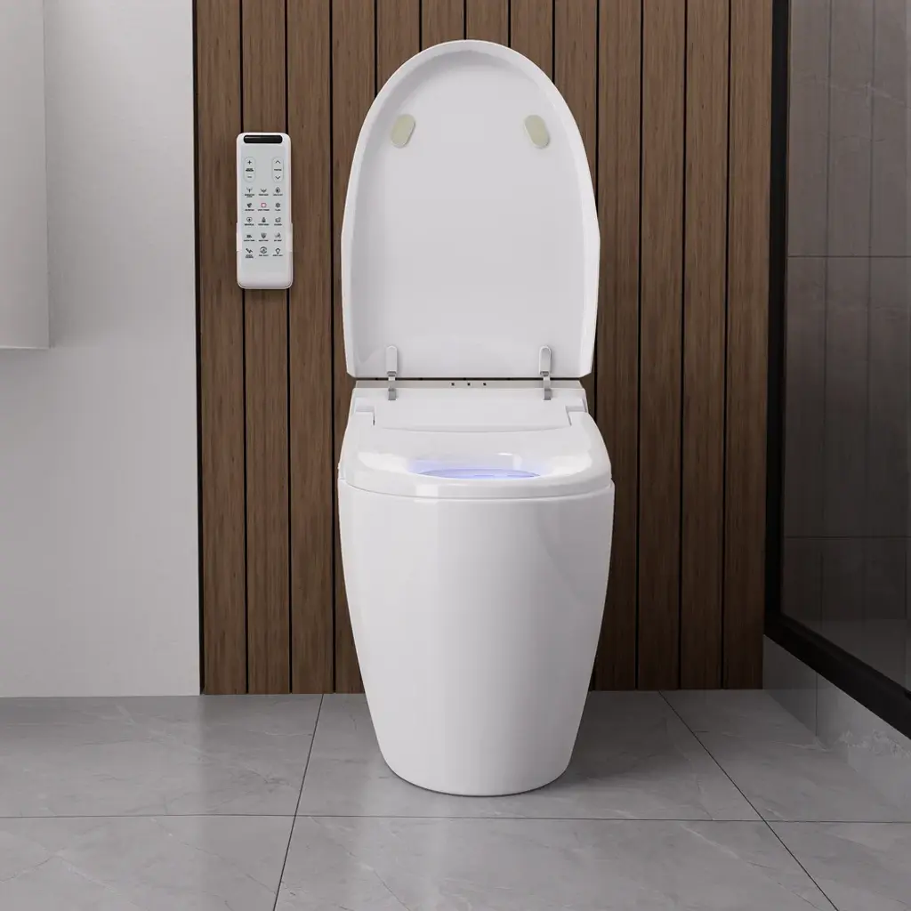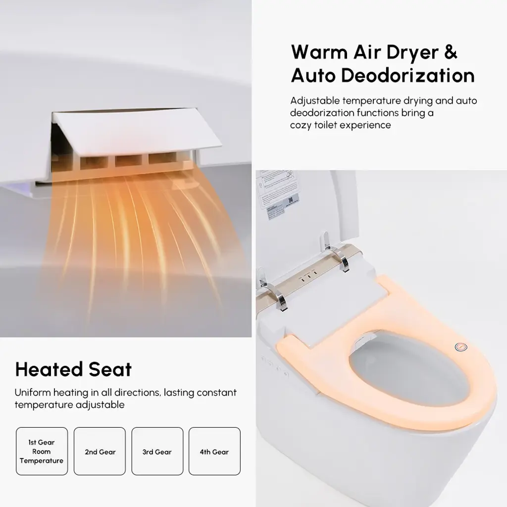This elongated one-piece smart toilet will instantly lift up any bathroom. The minimalist look makes it a stylish and very practical addition to your space.The heated seat, air-drying function, and night light enhance your experience, while the eco-friendly design reduces the need for toilet paper.
