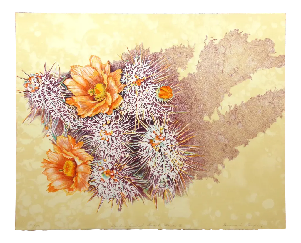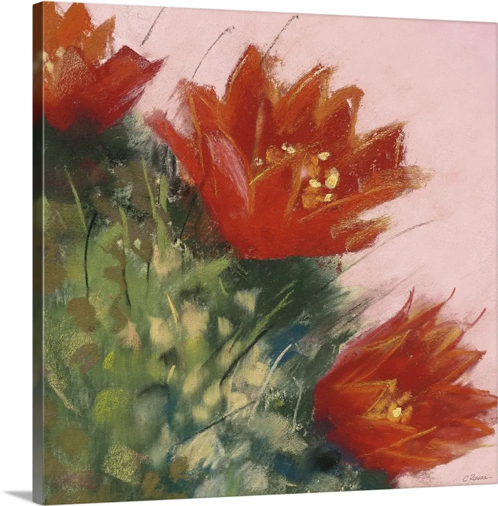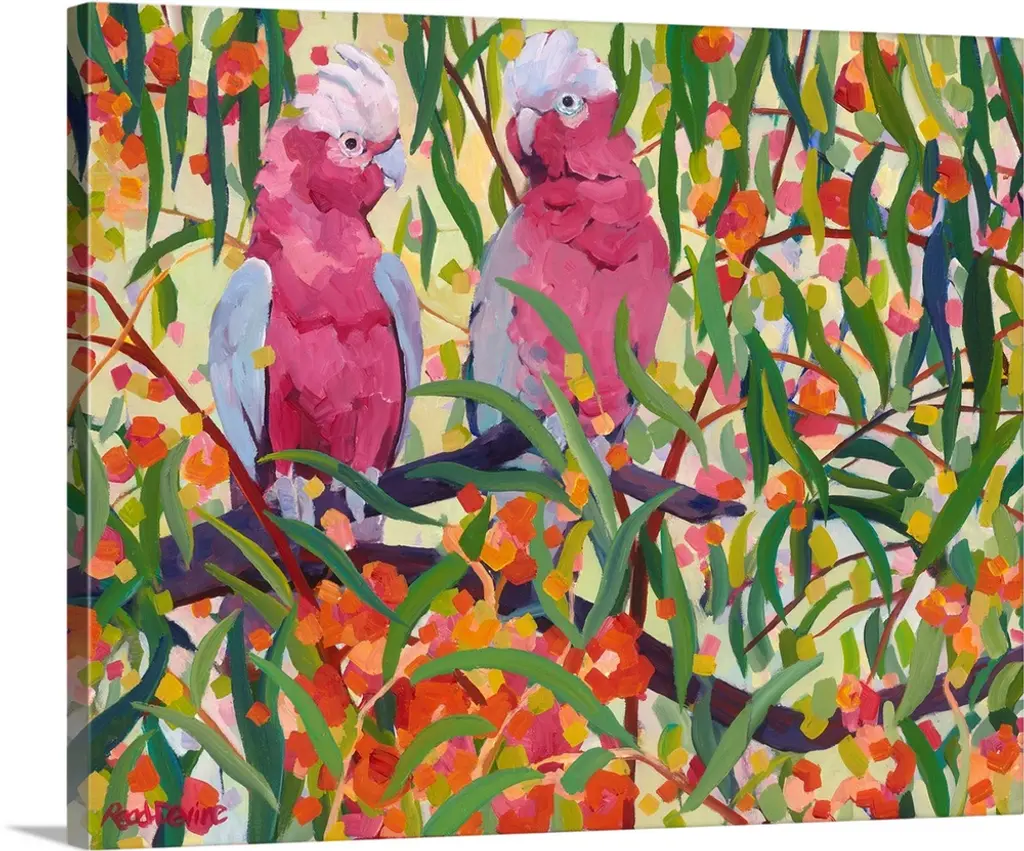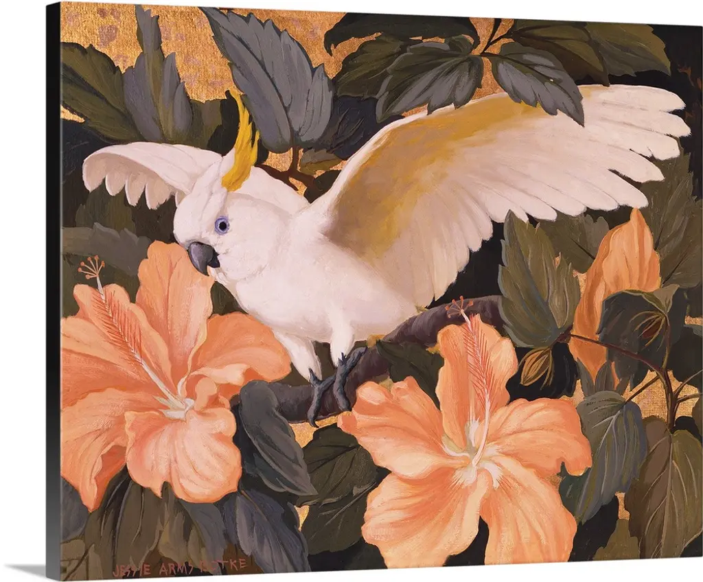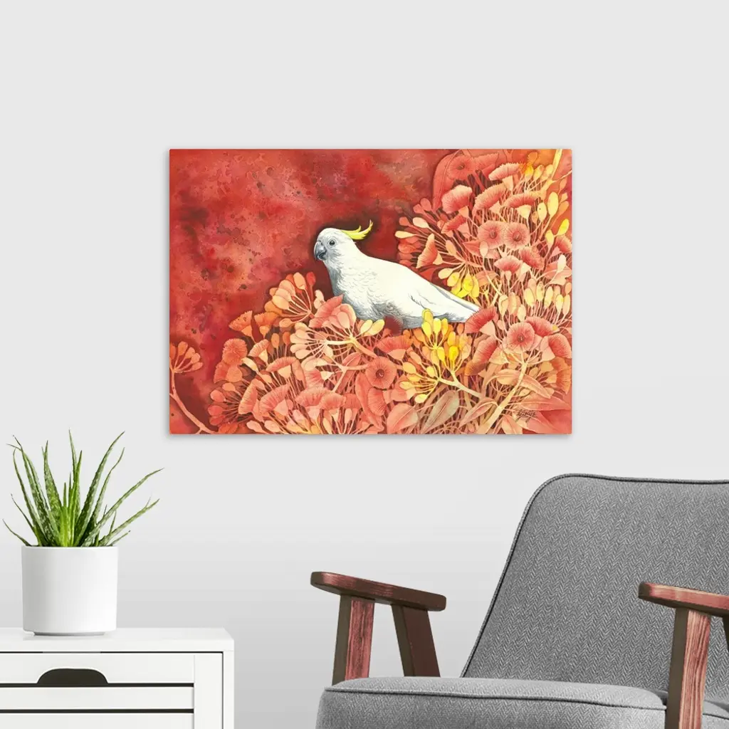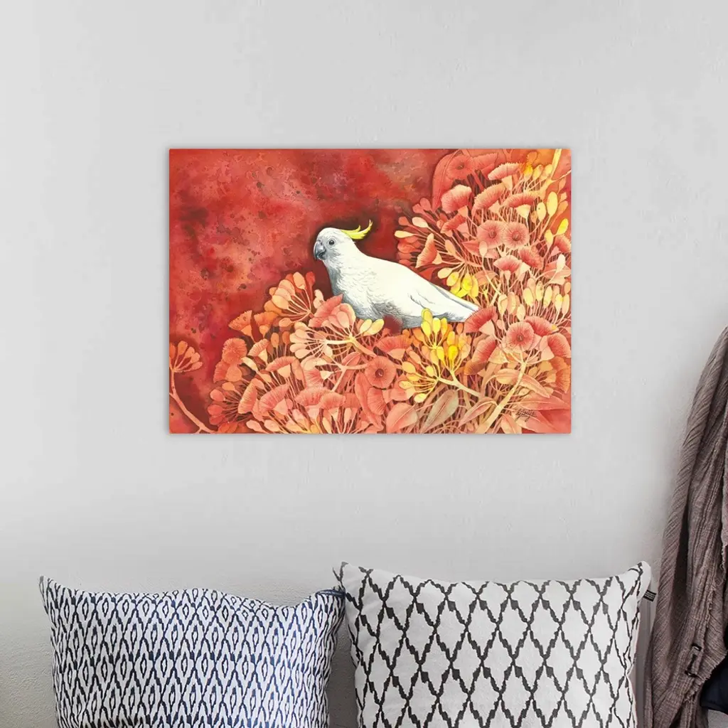 A smart cockatoo bird painted on the red hot floral background in watercolor on paper.