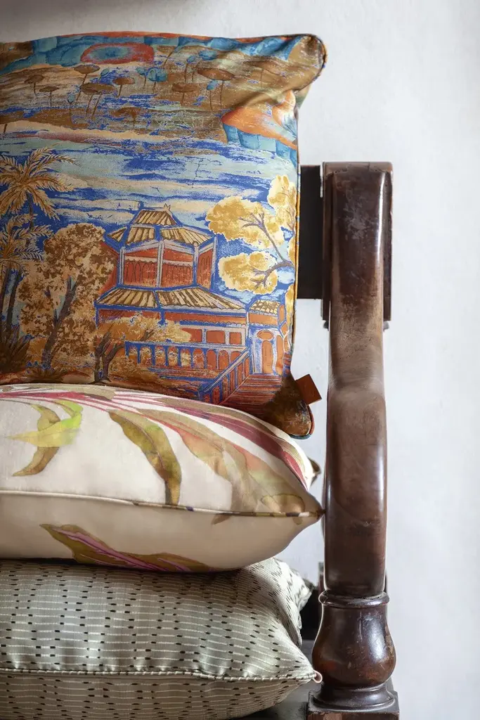 The splendour of silk, the depth of velvet, the finesse of linen, the natural beauty of leather; soft and opulent colours, rich and refined patterns. Poltrona Frau's Decorative Pillows add a precious note of personal and authentic taste to any home. For the collection's debut, which includes 17 different proposals, the Tolentino based company took inspiration from two of the most refined and interesting reference points of international textile decoration: the colour designer India Mahdavi and the legendary silk genius, Jim Thompson. Five pillows are covered with precious, 100% cotton velvet chosen from Pierre Frey's End Velvet Collection. India Mahdavi designed the colour range. She is a designer appreciated worldwide for her eclectic and elegant use of colour. Sensual to the touch, velvet adds joyfulness and light to the designer's colours. Poltrona Frau has chosen the nuances Fine Powder, Fine Terracotta, Fine Dijon, Fine Fouger and Fine Duck and paired them with five colours of Pelle Frau® leather used to add a very thin piping around the edges of the pillows. The label bearing the company's logo is also in Pelle Frau® leather.