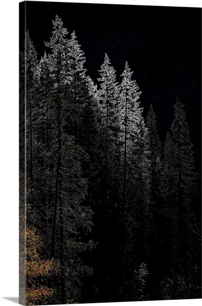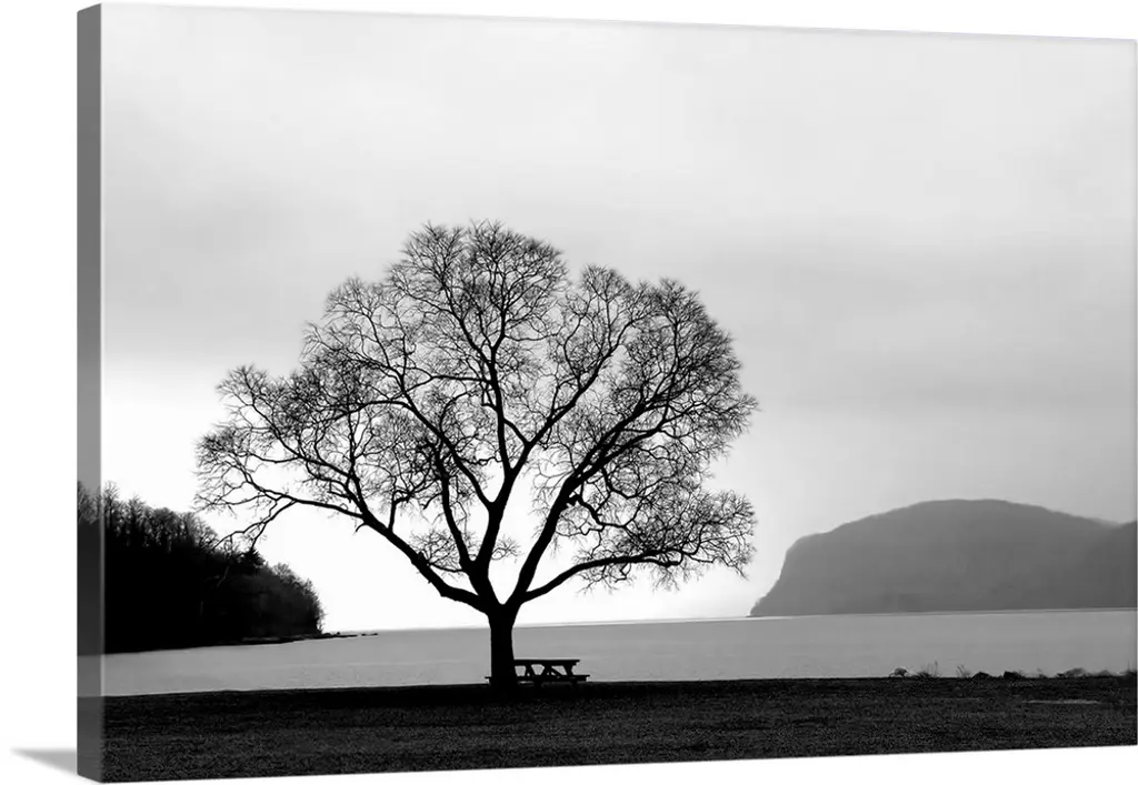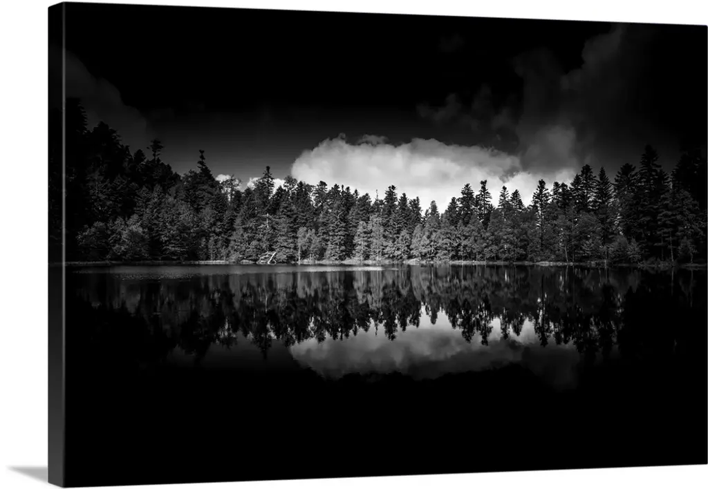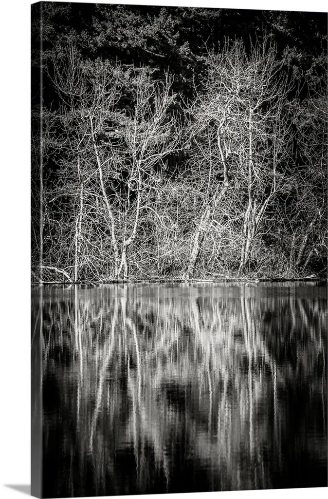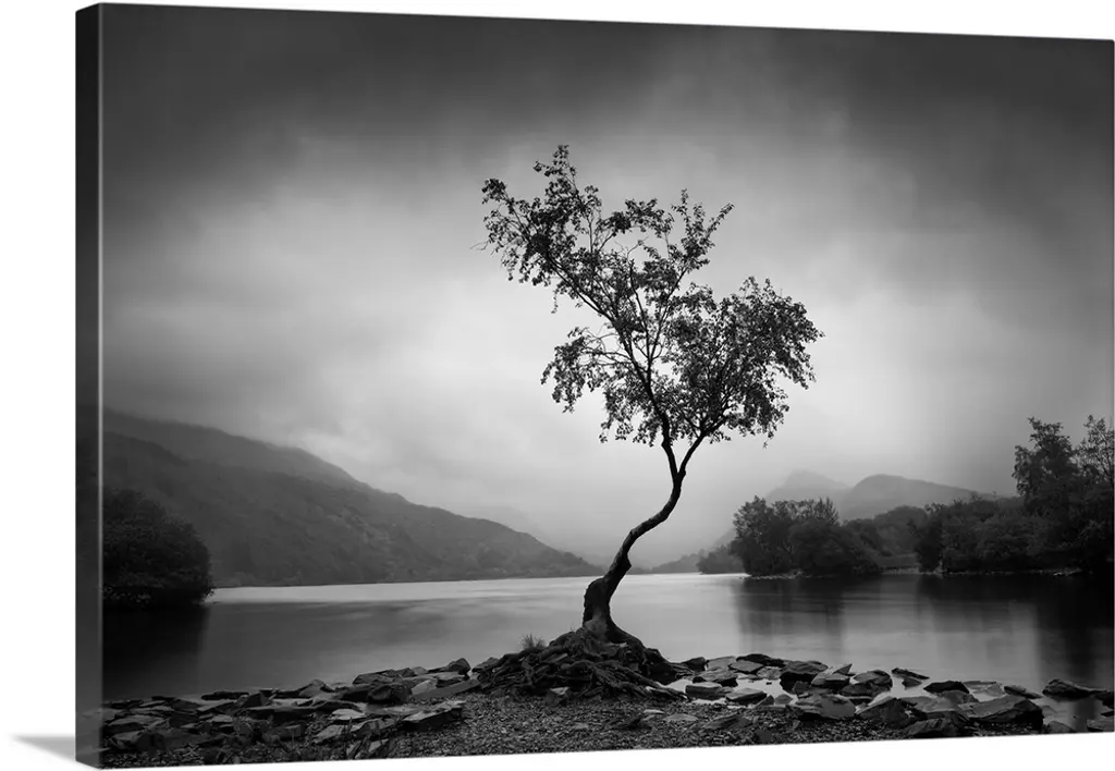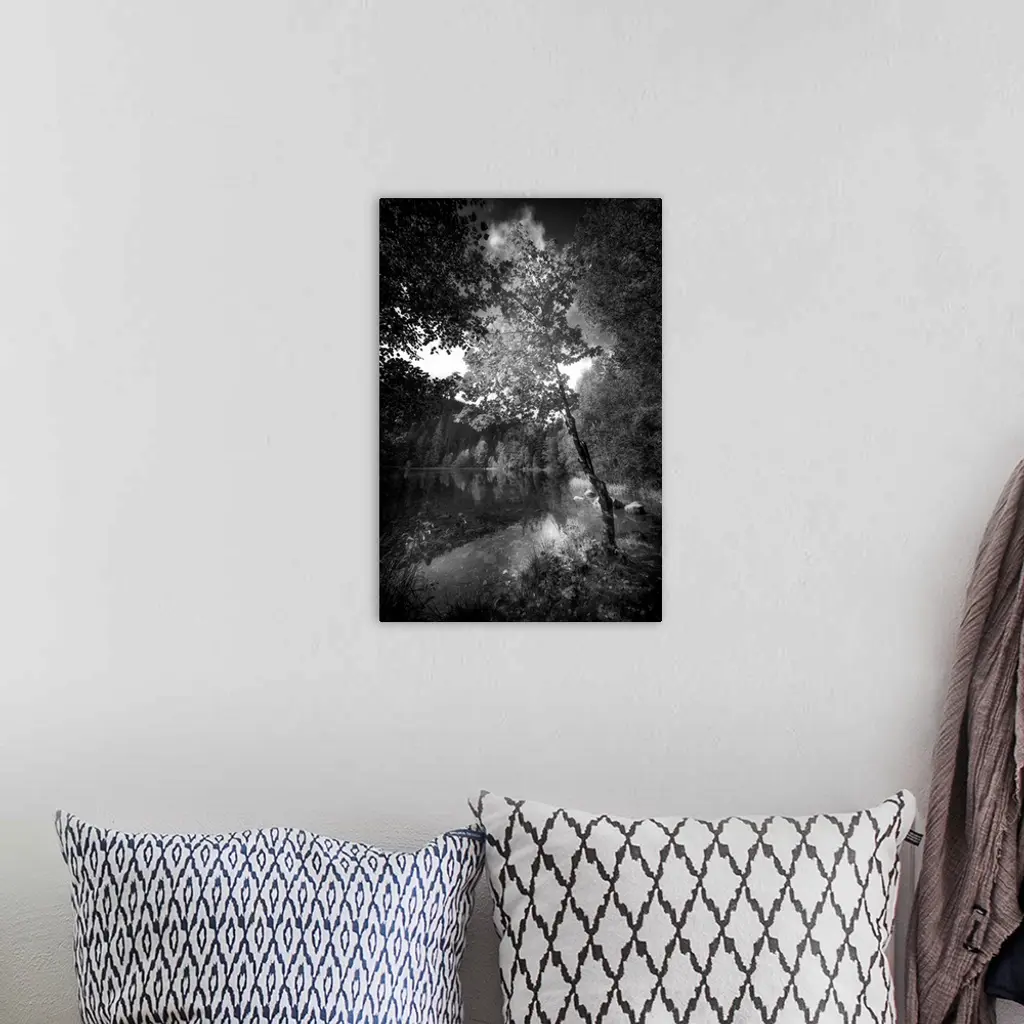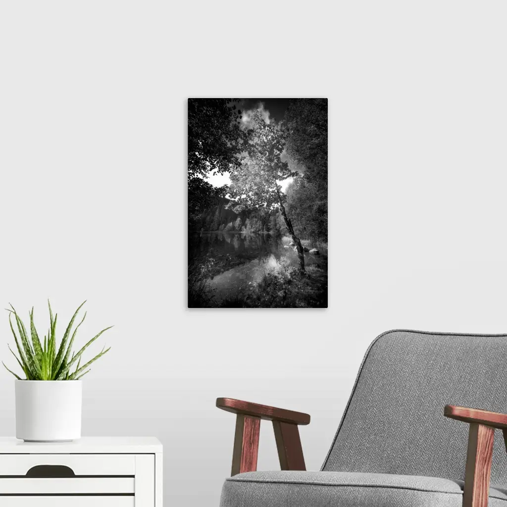 Black and white photograph of a small lake in a forest, concentrating on a single tree along the bank of the water.