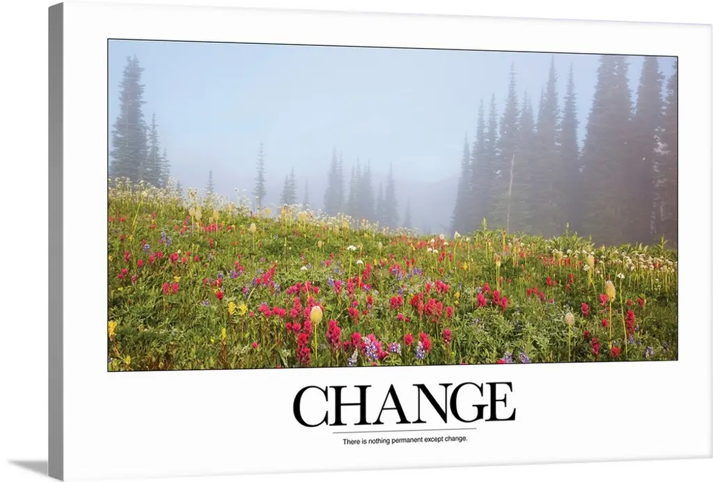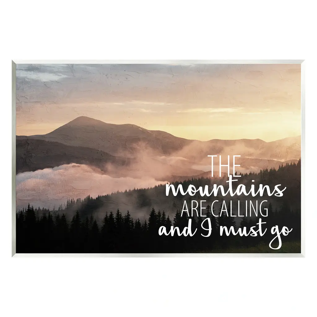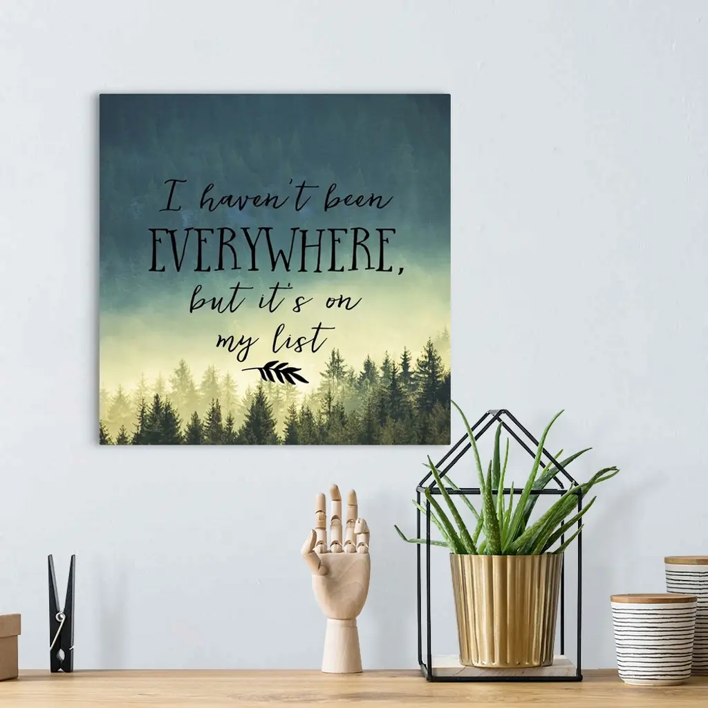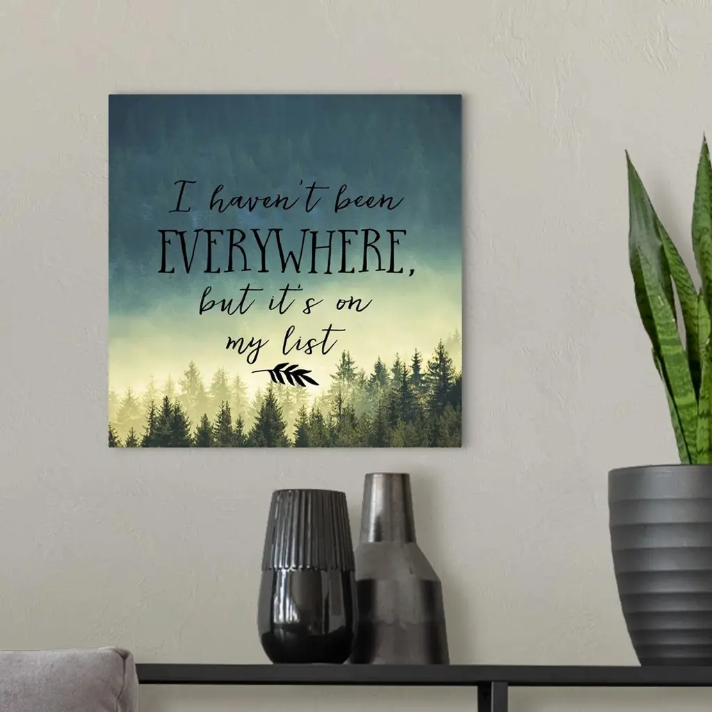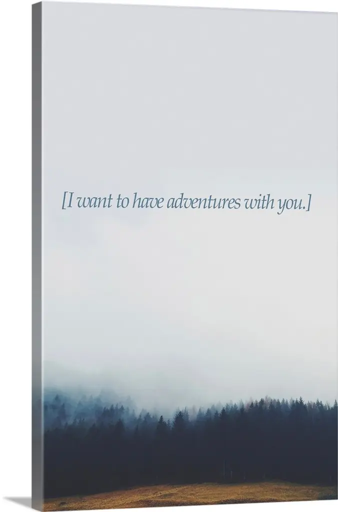 Handwritten message about adventure and travel, over an image of a misty pine forest.