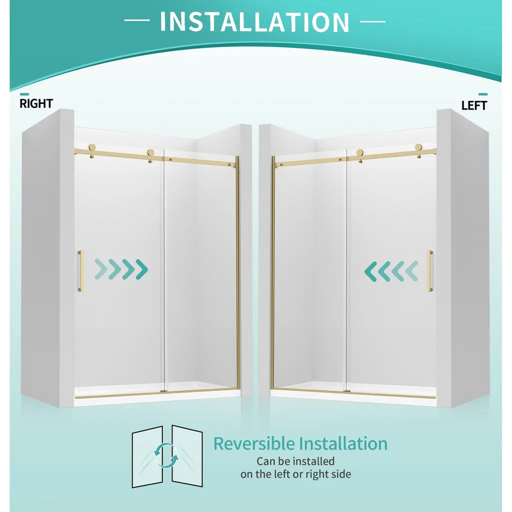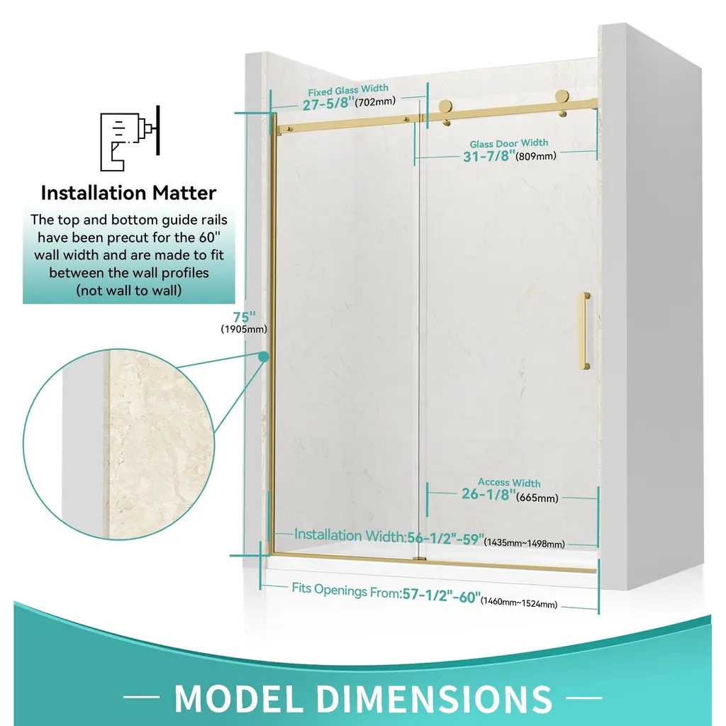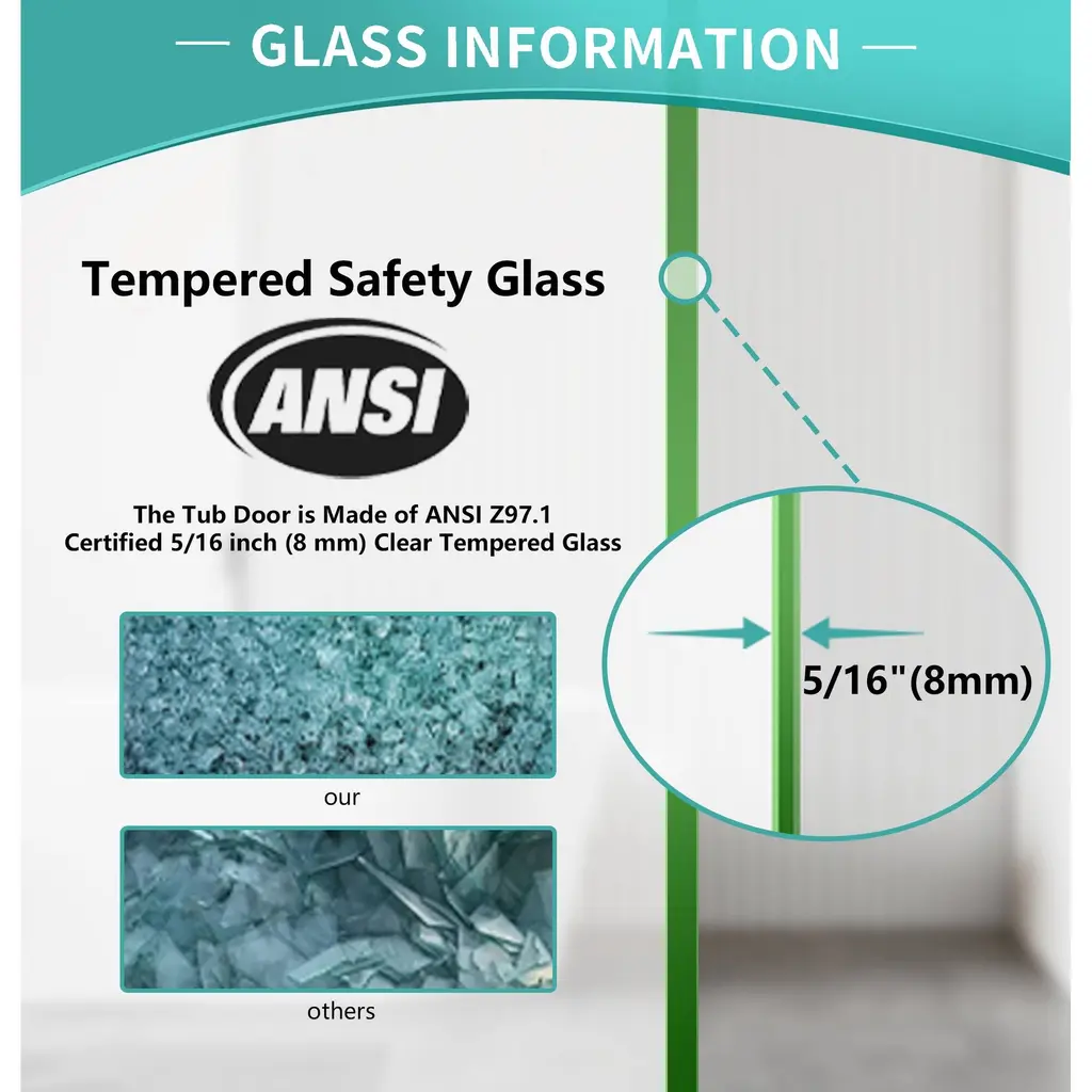 Introducing our high-end sliding shower door, a pinnacle of modern style and sophistication. Crafted from 5/16" (8mm) tempered clear glass, this frameless sliding bathtub door combines elegance with durability. Featuring advanced glass coating technology, it ensures easy cleaning and maintains a pristine, transparent finish. 55" to 59" in width and 75" in height single sliding entry offers effortless operation with smooth, quiet gliding. Enjoy your shower time with the convenience of reversible installation, tailored to fit your bathroom layout seamlessly.Features:✔ Shower door dimensions: 55-59 inches wide x 75 inches high.✔ Reversible installation:Shower door opening can be installed on either left or right side.✔ Tempered safety glass, ANSI and SGCC certified.✔ Track can be trimmed up to 4 inches based on installation area or bathtub width.✔ Door width: 31-7/8 inches, walk-in opening: 26-1/8 inches.✔ Large solid stainless steel rollers for smooth sliding operation.✔ Waterproof seals for excellent water resistance, keeping areas dry and separate.✔ Accommodates up to 2/3 inch door side for out-of-plumb installation (uneven walls). The fixed panel side has up to a 1-inch adjustment option.✔ This shower door includes 1 sliding door, 1 fixed panel, and 1 hardware kit, along with step-by-step instructions.