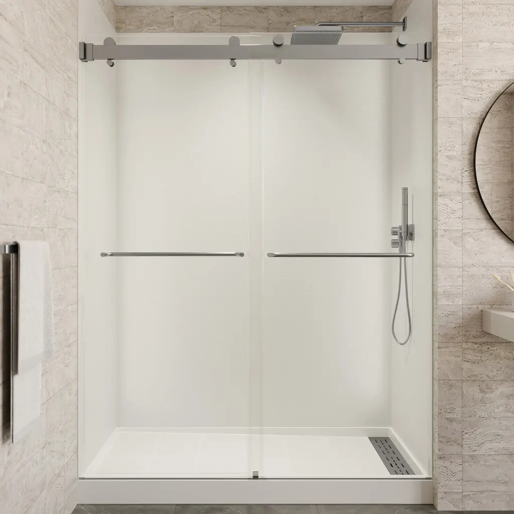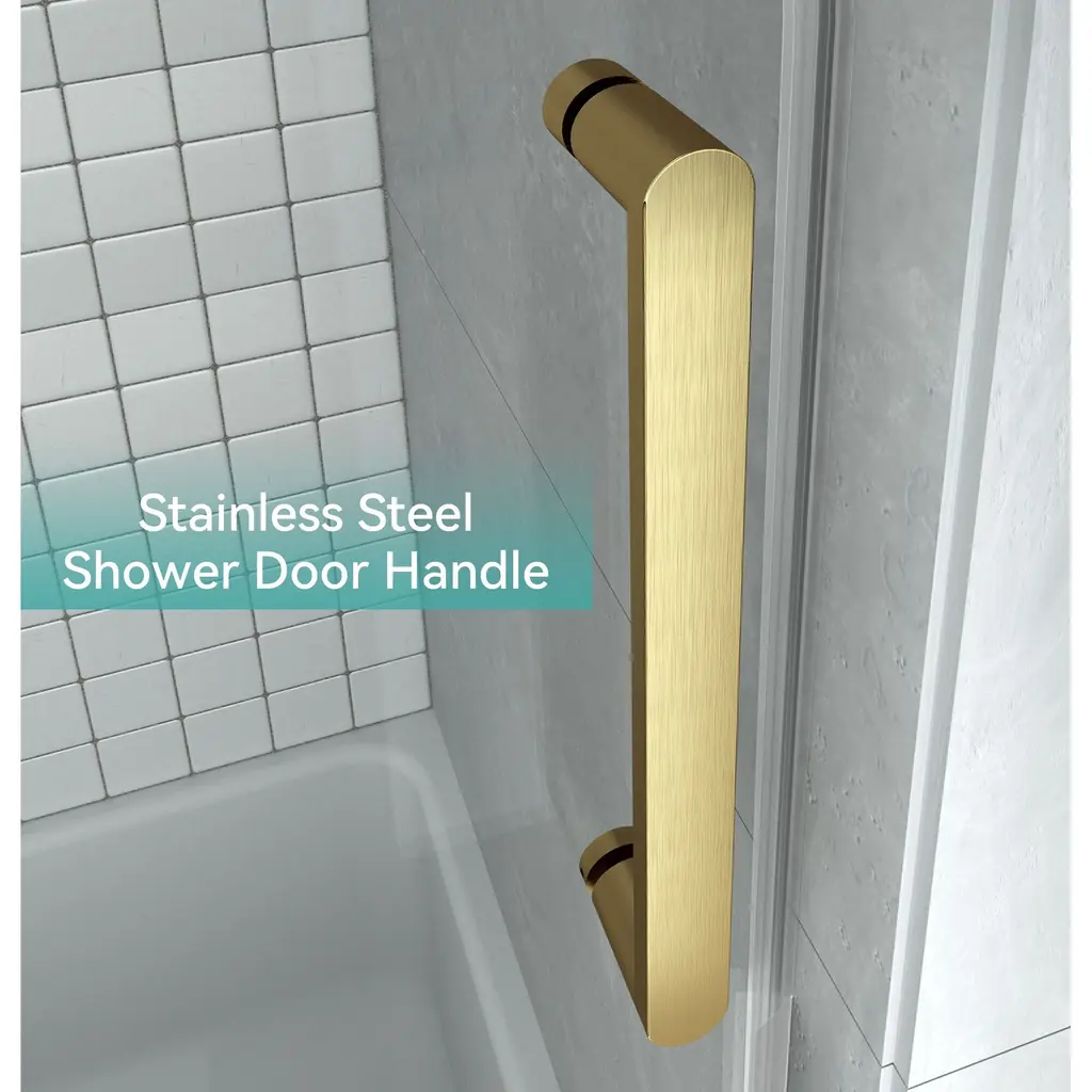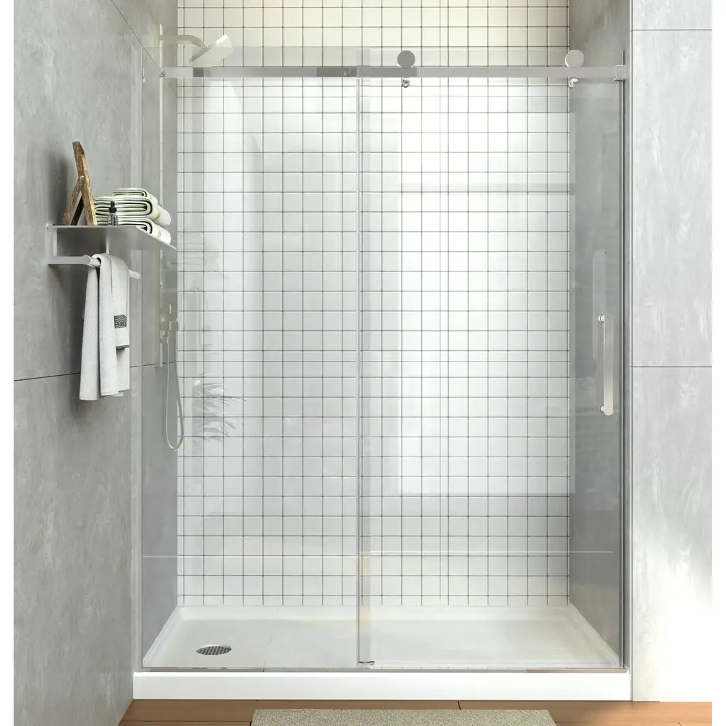 Introducing our high-end sliding shower door, a pinnacle of modern style and sophistication. Crafted from 5/16" (8mm) tempered clear glass, this frameless sliding bathtub door combines elegance with durability. Featuring advanced glass coating technology, it ensures easy cleaning and maintains a pristine, transparent finish. 55" to 59" in width and 75" in height single sliding entry offers effortless operation with smooth, quiet gliding. Enjoy your shower time with the convenience of reversible installation, tailored to fit your bathroom layout seamlessly.Features:✔ Shower door dimensions: 55-59 inches wide x 75 inches high.✔ Reversible installation:Shower door opening can be installed on either left or right side.✔ Tempered safety glass, ANSI and SGCC certified.✔ Track can be trimmed up to 4 inches based on installation area or bathtub width.✔ Door width: 31-7/8 inches, walk-in opening: 26-1/8 inches.✔ Large solid stainless steel rollers for smooth sliding operation.✔ Waterproof seals for excellent water resistance, keeping areas dry and separate.✔ Accommodates up to 2/3 inch door side for out-of-plumb installation (uneven walls). The fixed panel side has up to a 1-inch adjustment option.✔ This shower door includes 1 sliding door, 1 fixed panel, and 1 hardware kit, along with step-by-step instructions.