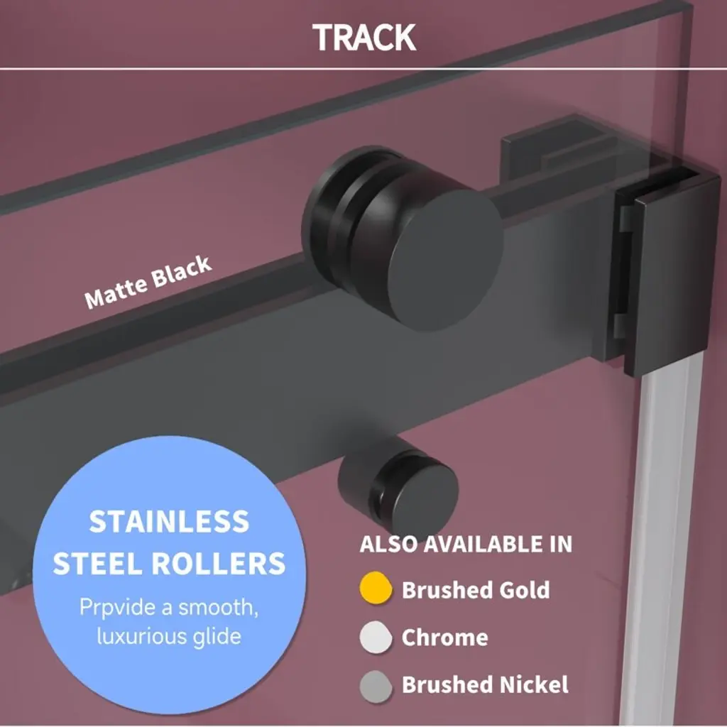 Description:Measuring 56-60 inches wide × 60 inches high, this bath tub shower door seamlessly blends luxury and durability. It features heavy-duty hardware for enhanced stability and silent operation. The 3/8 inch (10mm) thick glass is ANSI and SGCC certified, ensuring safety and reliability. With advanced glass coating technology, it repels soap scum and grime, making maintenance effortless.Discover the perfect blend of sophistication and functionality — because you deserve the best shower experience every day.Features:Available in matte black, brushed nickel, brushed gold and chrome colorsThe coating is waterproof, prevents soap scum and dirt, and is easy to clean56-60" W x 60" H double sliding glass panels3/8 inch ( 10mm ) tempered clear glass, ANSI certified, SGCC certified, safe and reliableQuiet and smooth sliding operation with large solid stainless steel rollersCan be installed on the left or right side of any straight bathtubAdjustable width up to 4 inches for a perfect fitLong handle design can be used for sliding and also serves as a towel barHardware surface finish: Stainless Steel running rail, door handle and rollersWhat’s included?This shower door comes with 3 carton boxes, 2 glass doors,1 hardware pack with illustrated step by step instructions. Multiple box packaging is designed to help ease of handling and prevent any damage in products by overloading the weight.