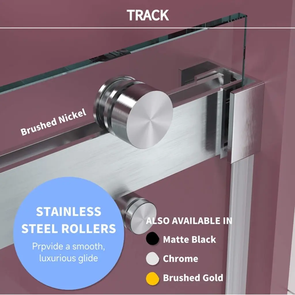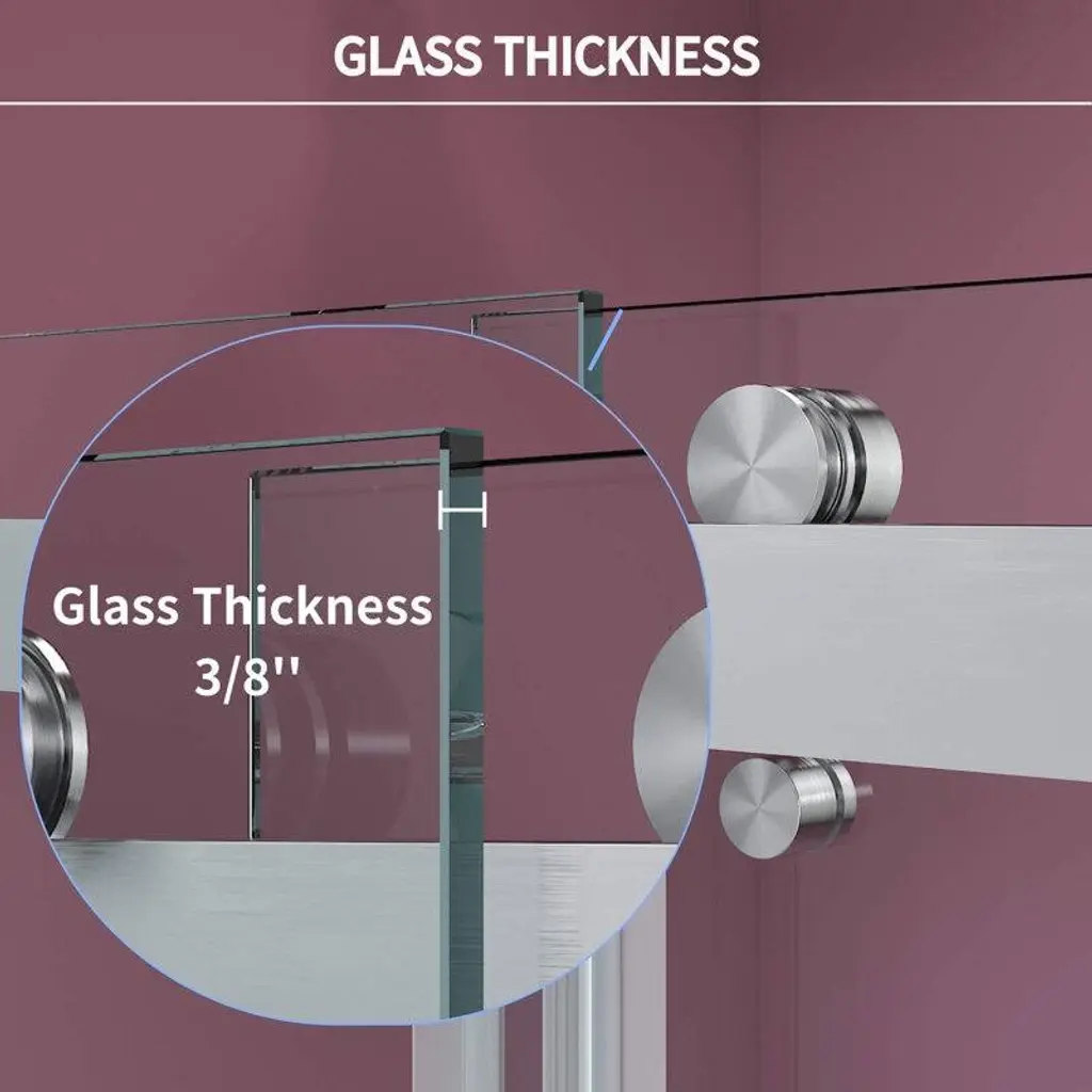 Description:Measuring 56-60 inches wide × 66 inches high, this bath tub shower door seamlessly blends luxury and durability. It features heavy-duty hardware for enhanced stability and silent operation. The 3/8 inch (10mm) thick glass is ANSI and SGCC certified, ensuring safety and reliability. With advanced glass coating technology, it repels soap scum and grime, making maintenance effortless.Discover the perfect blend of sophistication and functionality — because you deserve the best shower experience every day.Features:What’s included?This shower door comes with 3 carton boxes, 2 glass doors,1 hardware pack with illustrated step by step instructions. Multiple box packaging is designed to help ease of handling and prevent any damage in products by overloading the weight.