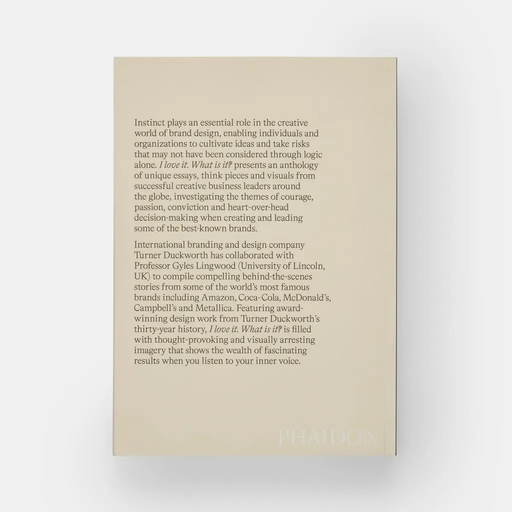 The internationally renowned design agency Turner Duckworth presents stories and advice gathered from working with the world’s biggest brandsNo other design company has worked with as many significant brands as Turner Duckworth, the company behind the visual identities of Amazon, McDonald’s, Coca-Cola, and even Metallica. I love it. What is it? showcases Turner Duckworth’s philosophies, learnings, and adventures from more than three decades of working with major brands and presents the firm’s unique and optimistic outlook, along with hints, tips, and the inside scoop on what makes successful brands tick.The book, a fascinating anthology of essays, think pieces, and 150 color illustrations that explore the power of instinct in brand design, includes a selection of their familiar but captivating work alongside 20 contributions from leading voices of the design, business, and marketing worlds that explore creativity, instinct, failure, and more.Features texts from leaders in the fascinating but often-hidden worlds of design and branding, including: Moira Cullen (Former Design Director, Coca-Cola North America); Morgan Flatley (Executive Vice President, Global Chief Marketing Officer and New Business Ventures, McDonald’s); Linda Lee (Chief Marketing Officer, Campbell Meals & Beverages); Stefan Sagmeister (Designer, Sagmeister Inc.); Jessica Spence (President of North America, Beam Suntory); and more.