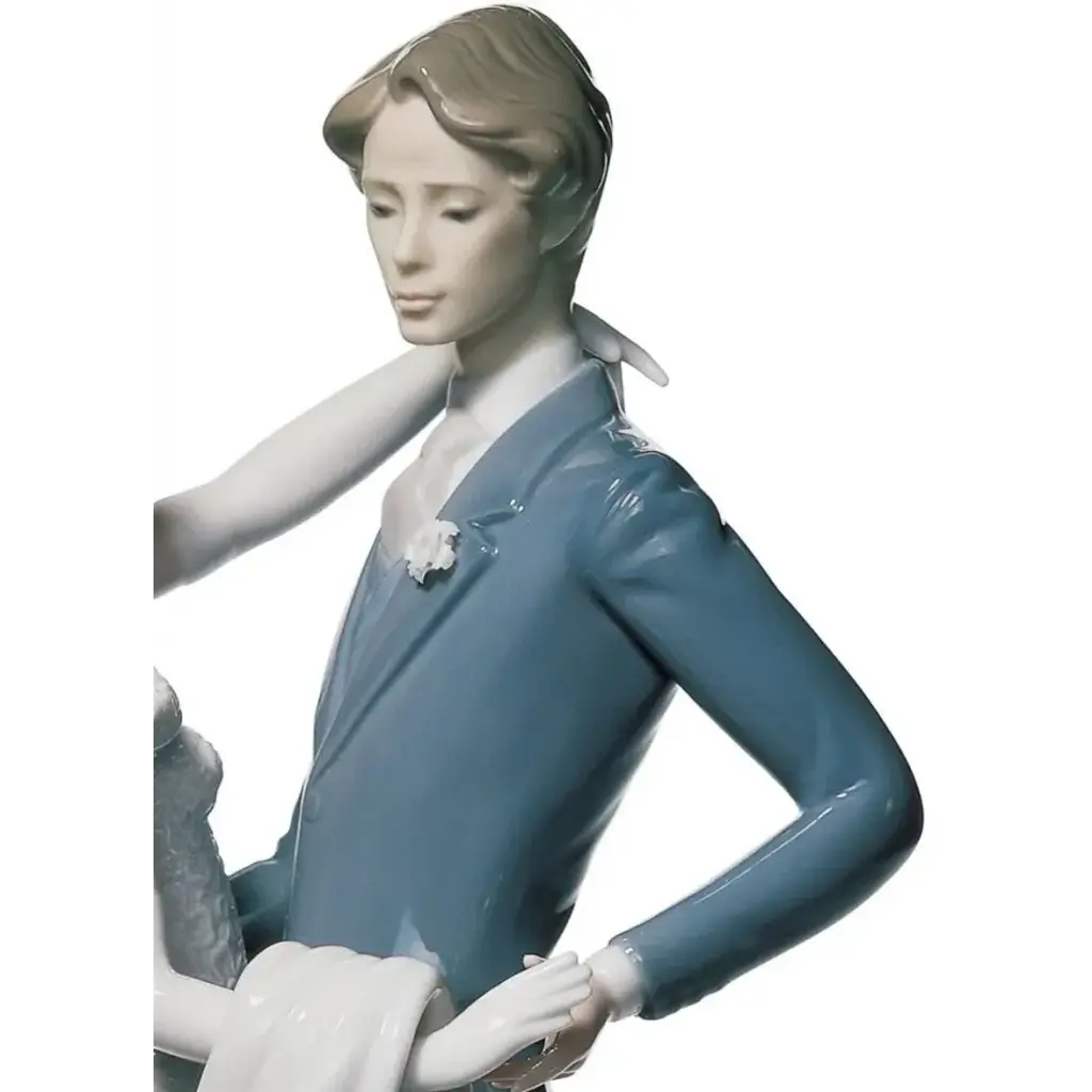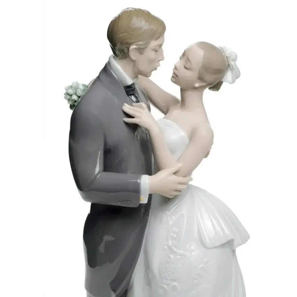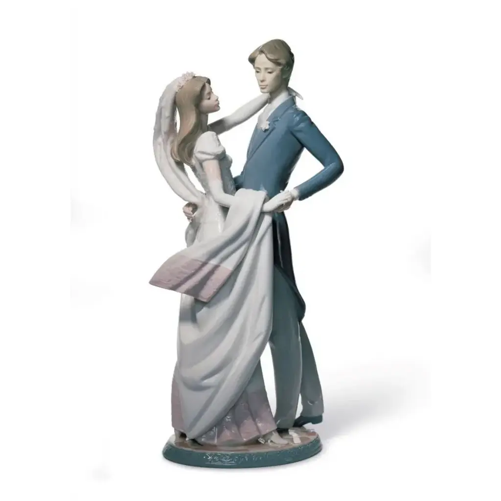 Glossy porcelain figurine of a dancing couple, she is in a soft pink dress with flower ornaments and he is in a blue jacket. An iconic Spanish brand, Lladro is a world leader in the creation of porcelain art. Started by brothers Juan, Jose and Vicente Lladro in 1953, the ceramic figurines were initially inspired by the works of great European manufacturers like Meissen and Sevres. Over time, a unique style was forged, consisting of elongated lines, a revolutionary single-firing method, and soft pastel tones.