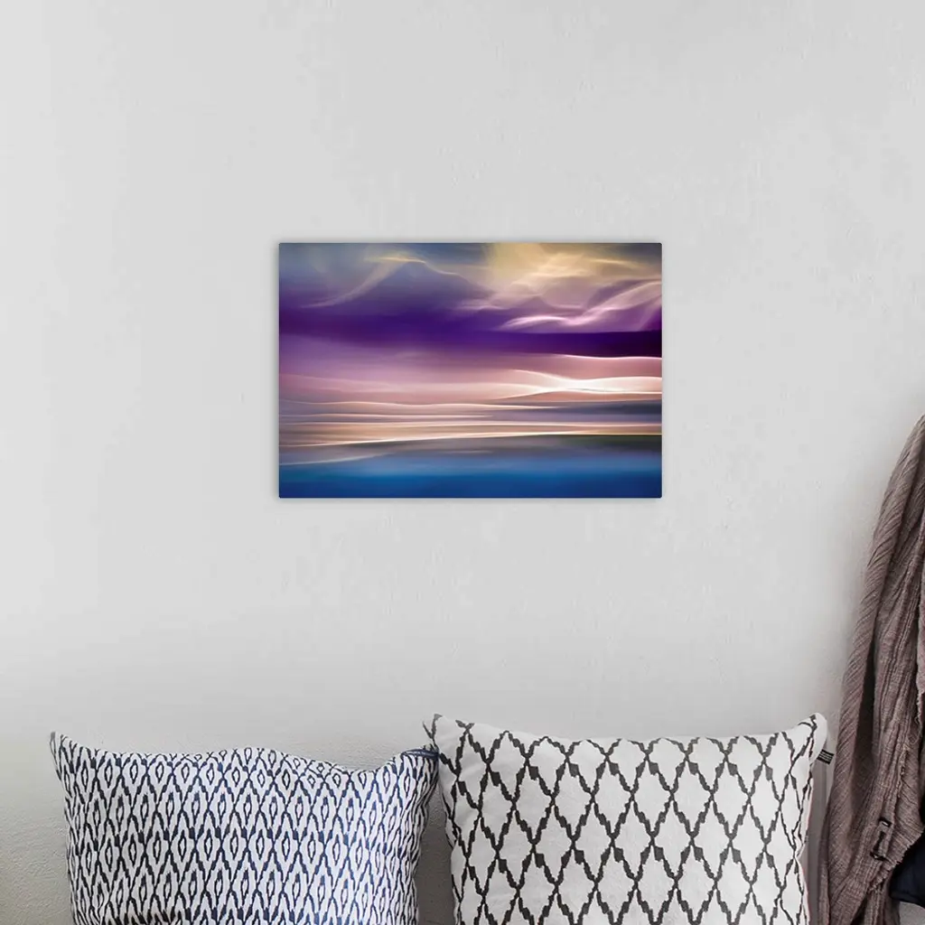 Abstract photograph with beams of light resembling mountains, in shades of pink and blue.