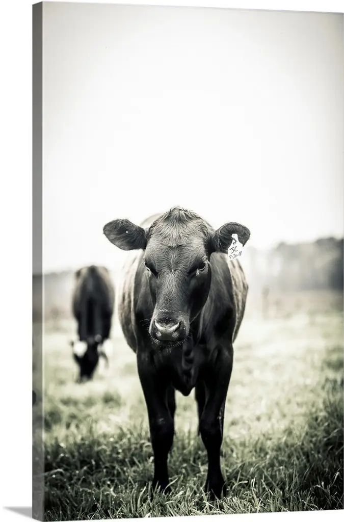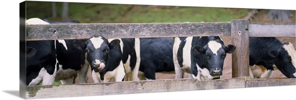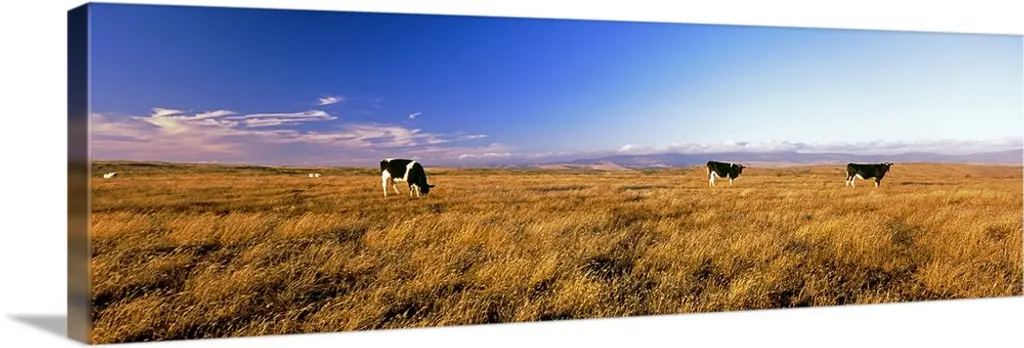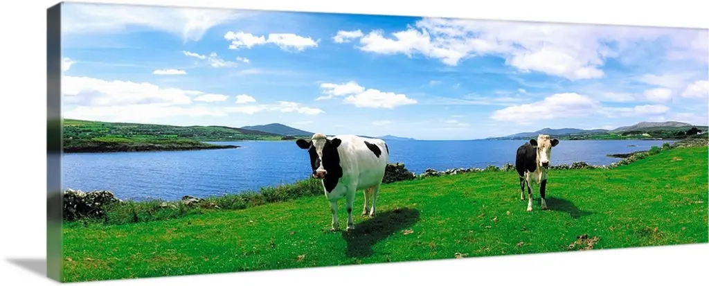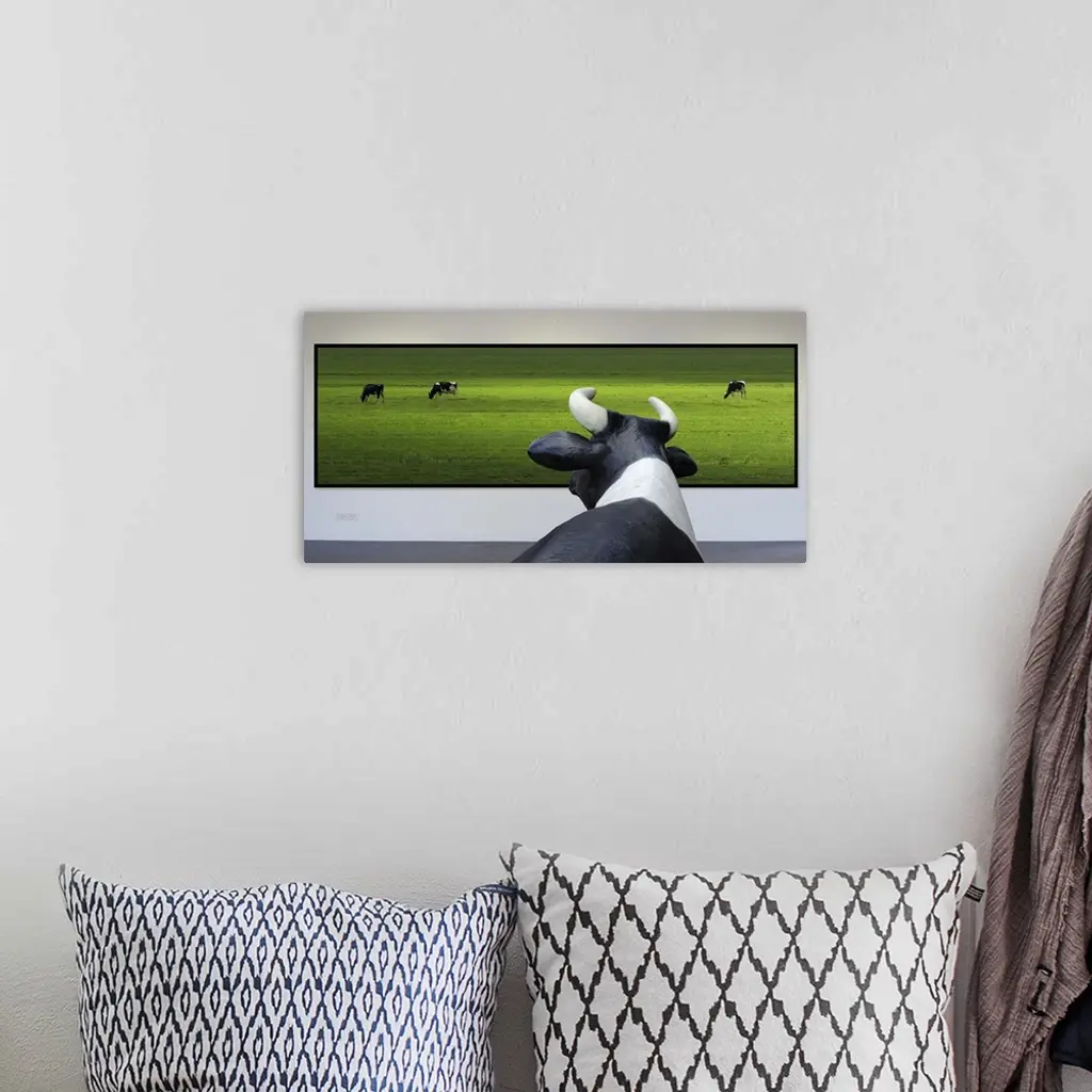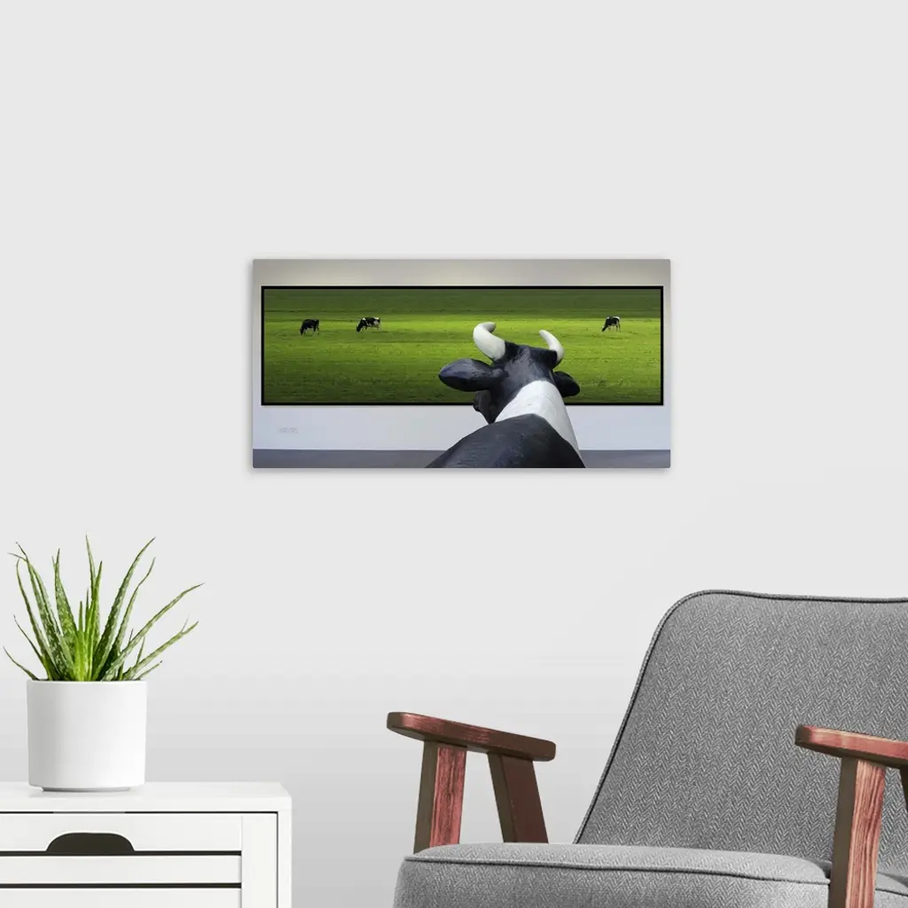 Conceptual image of a cow looking at a framed photo of other cows in a green field.