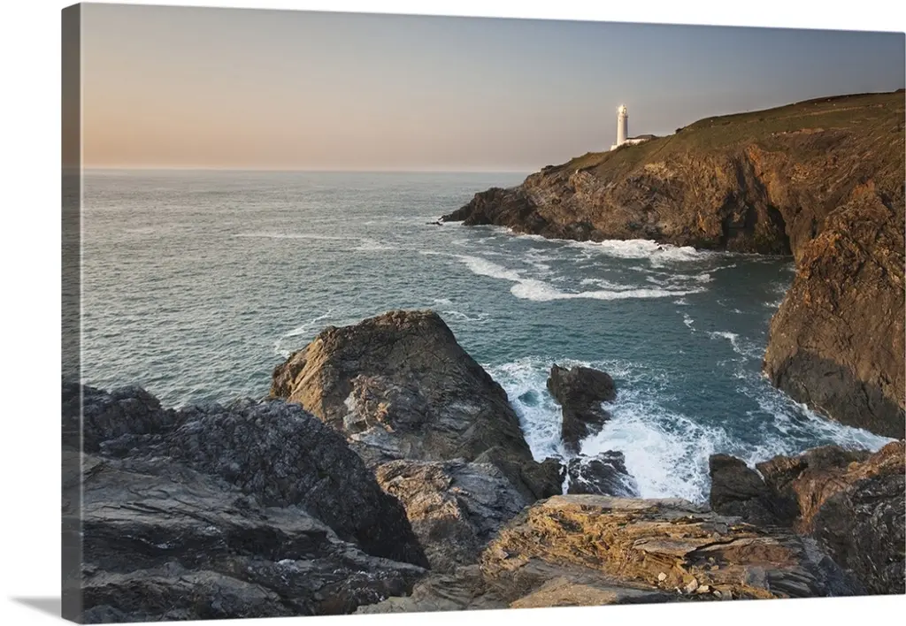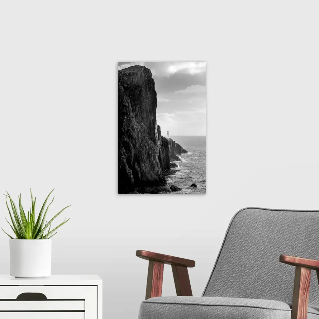 Fine art photo of a steep ocean cliff with rocks below, in black and white.