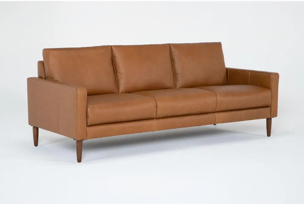 The Ian 83" Saddle Brown Leather Sofa is a perfect addition to any modern living room. This sofa combines comfort and style with its track arms and tapered legs, providing a sleek and inviting seating option. Its saddle brown leather upholstery adds warmth and sophistication to your space.
