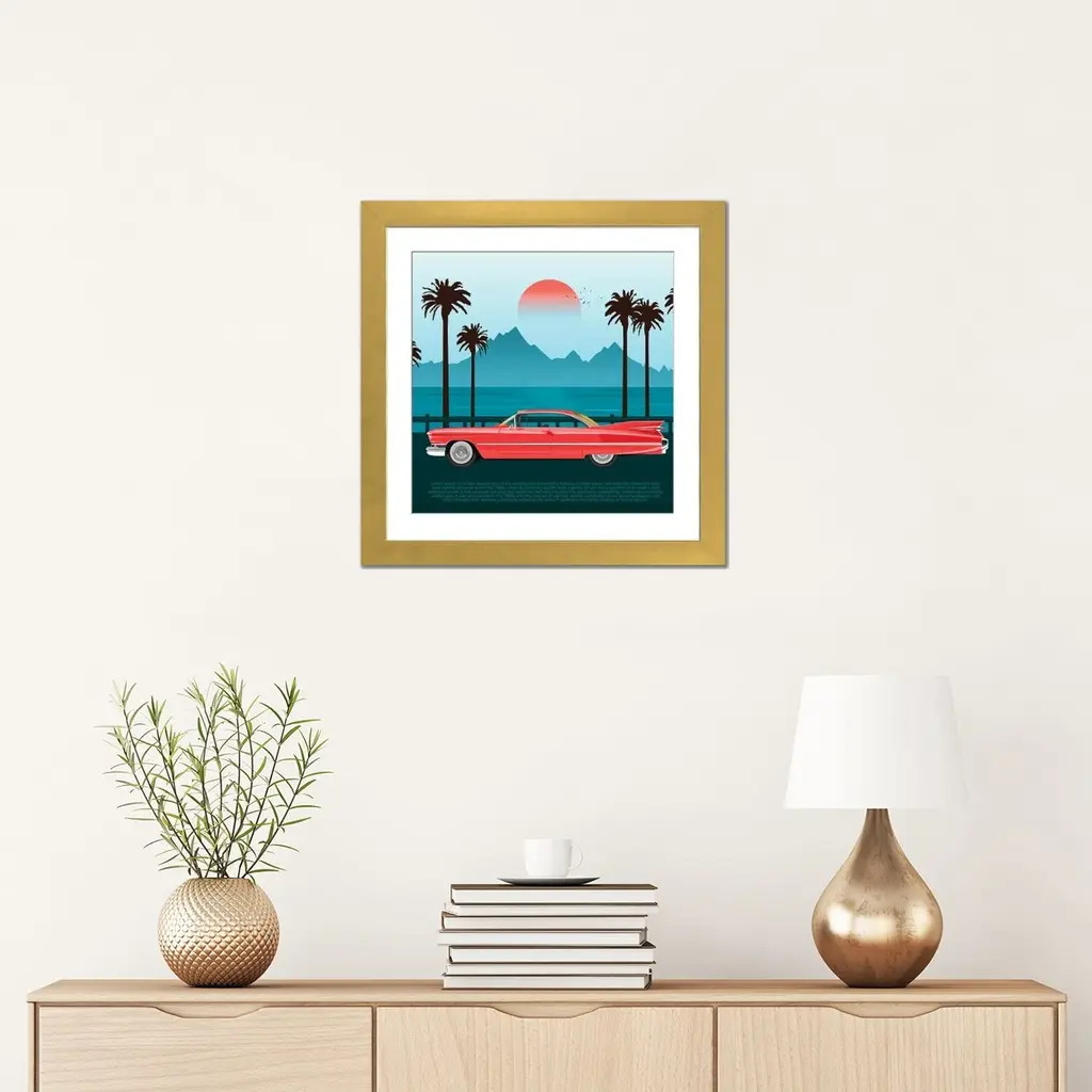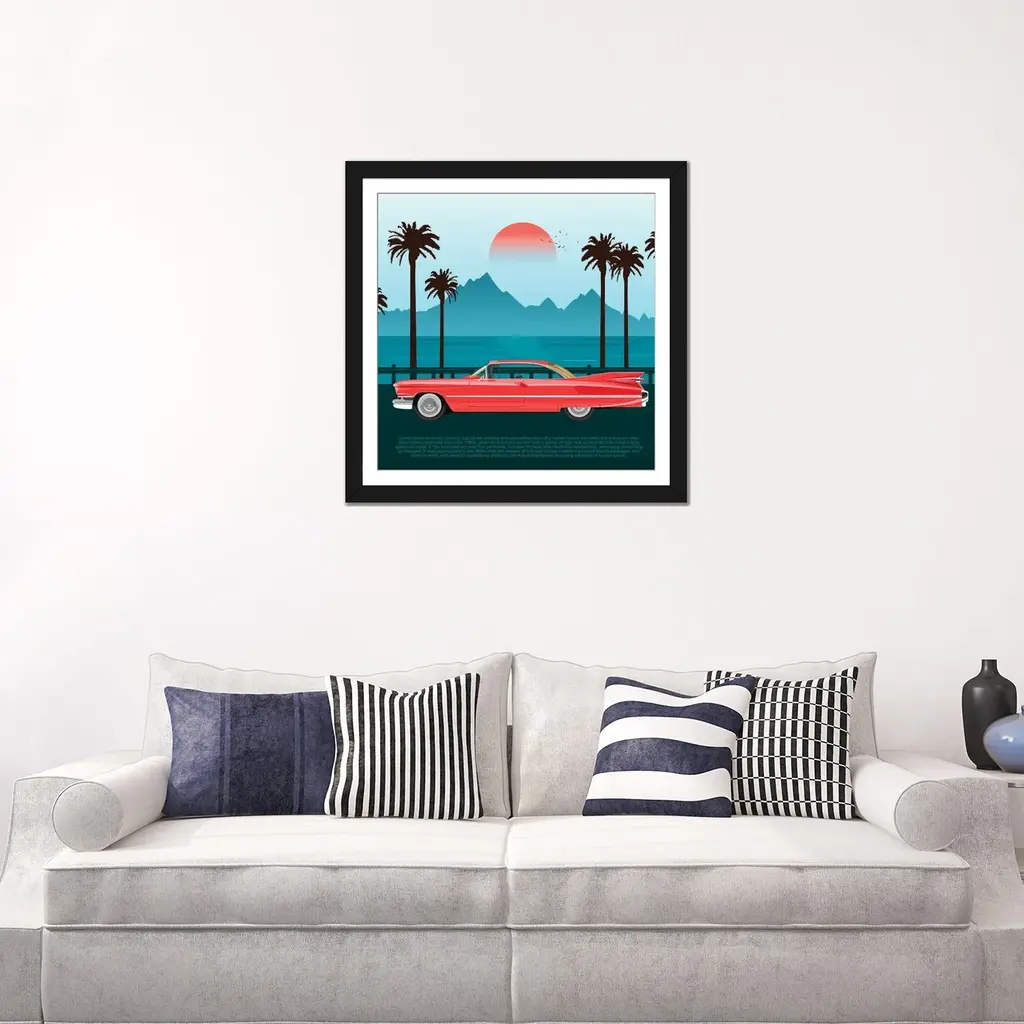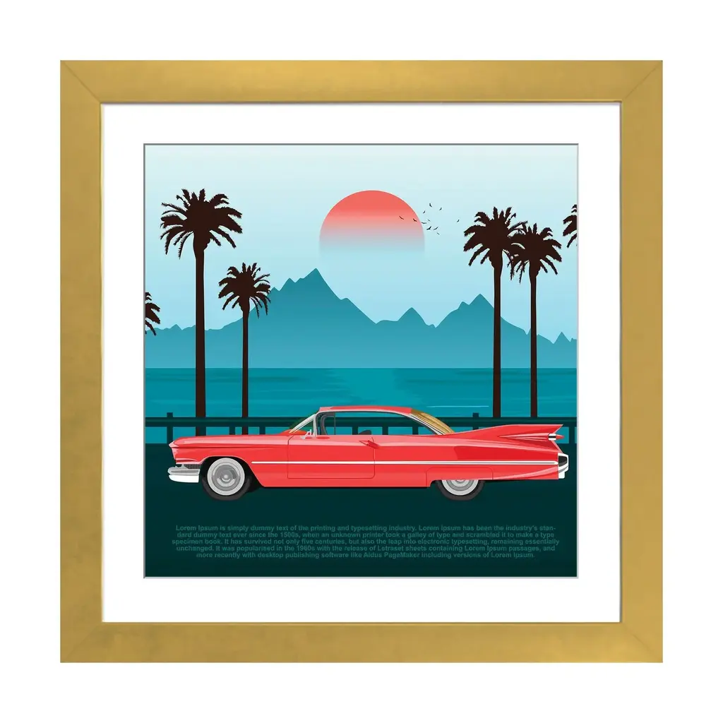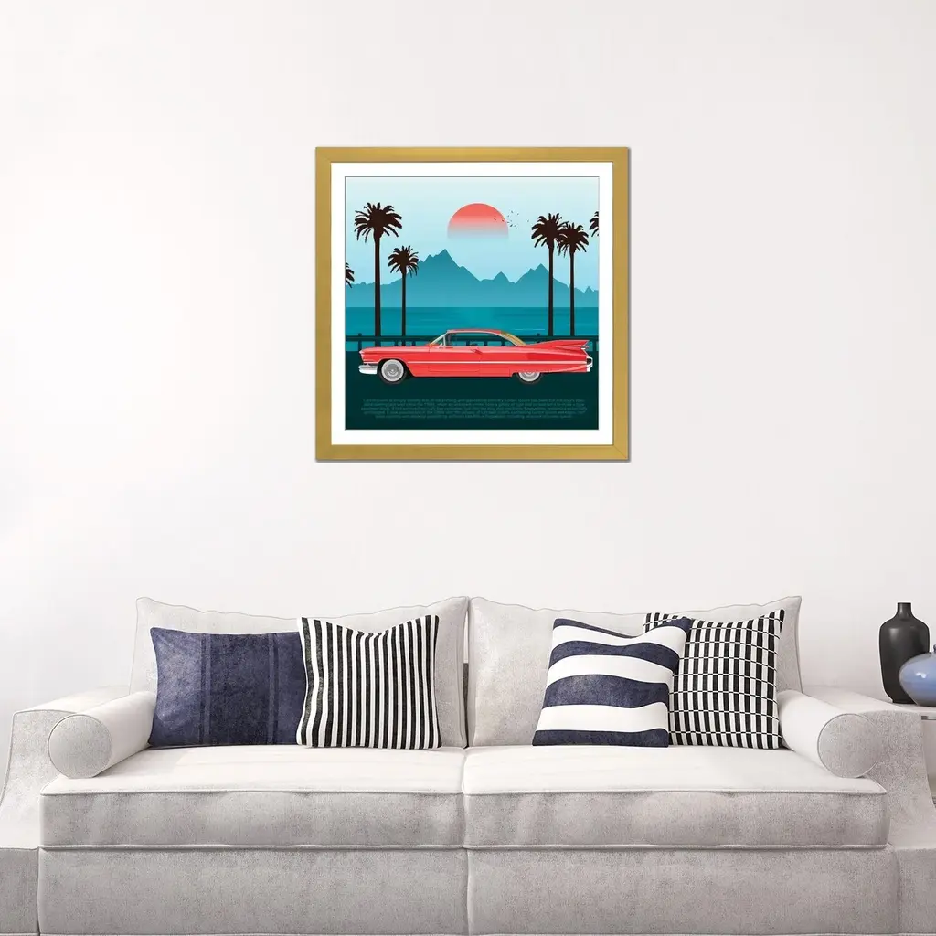 Icanvas "Red Retro Car On Road Near Blue Sea Or Ocean With Palm Trees And Mountains" By Flint01 - Natural - 24x24x1