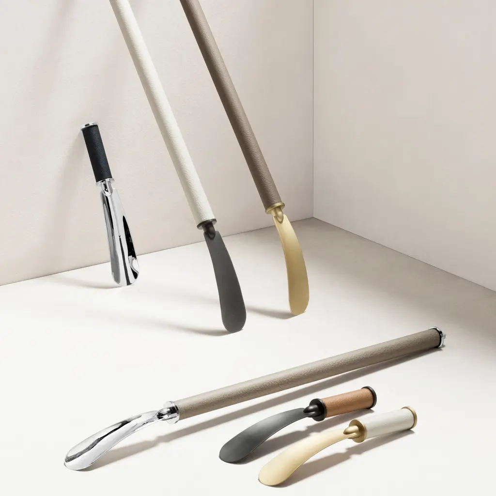 With a sleek form inspired by mythological flight, the Icaro Shoe Horn from Giobagnara brings modern elegance to a daily ritual. Expertly handcrafted in Italy, this piece features a slender, gracefully curved metal structure available in a range of polished finishes. The design is perfected with a comfortable, hand-wrapped grip of fine calfskin leather, providing a tactile contrast to the cool metal. A fusion of minimalist design and luxurious materials, it’s a sophisticated staple for any well-appointed wardrobe. Highlights: