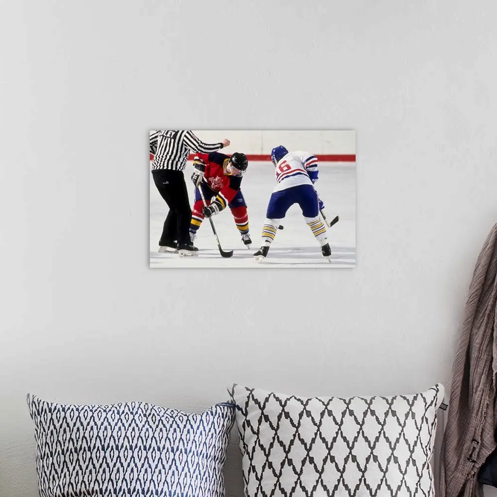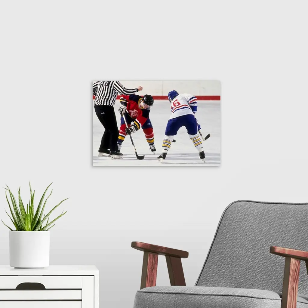 Ice hockey face off wall art for home and office decor. Discover canvas art prints, photos, mural, big canvas art and framed wall art in GreatBigCanvas.com's varied collections.