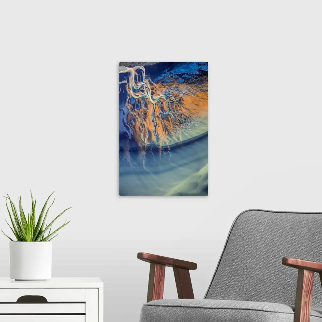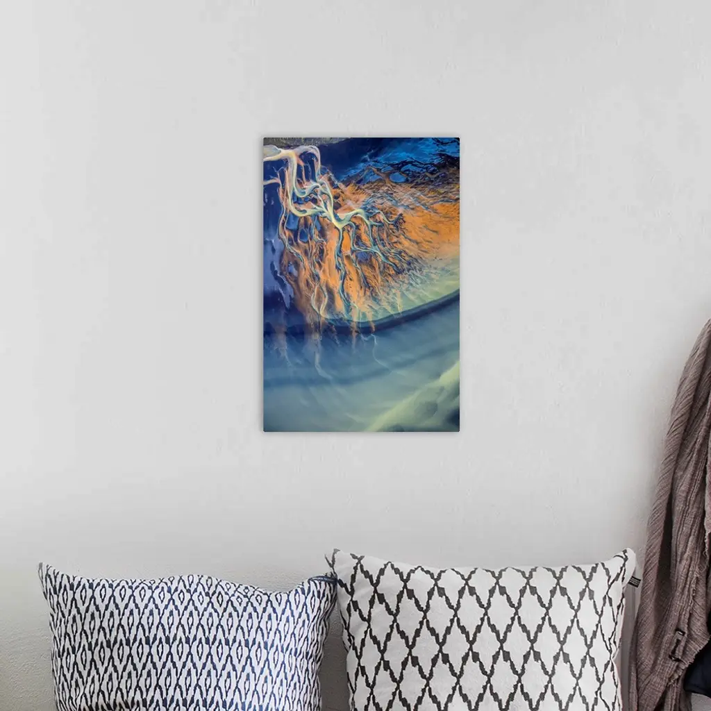 Aerial view of a river delta in Iceland, creating an abstract image.