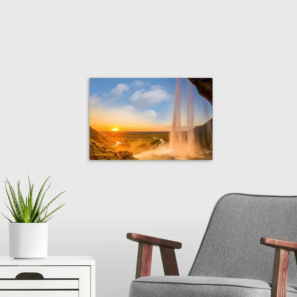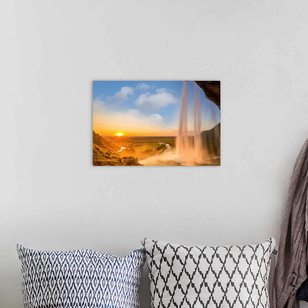 Iceland, Seljalandsfoss at sunset, waterfall and sun.