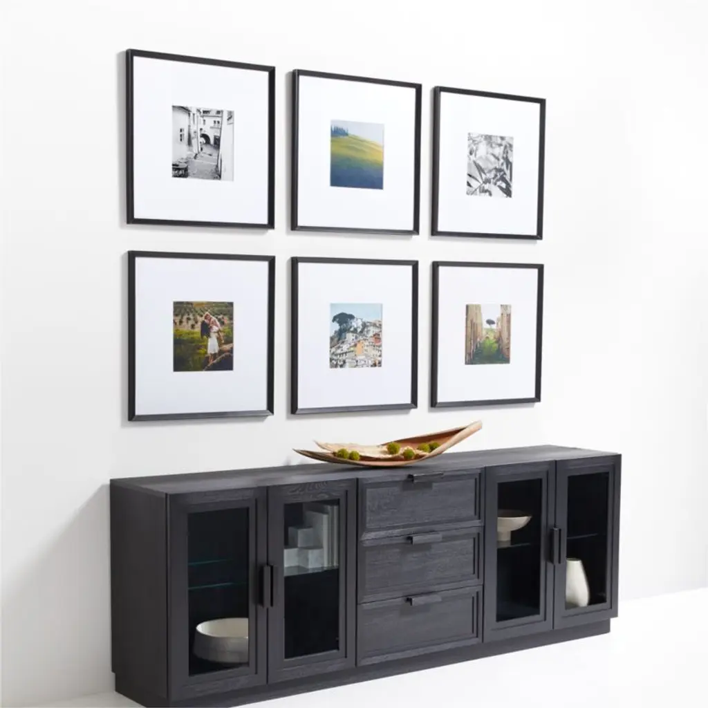 Create an instant gallery with this six-frame set. The classic frames give treasured photos the presentation they deserve. Thick white mats and beveled black frames elevate the most casual snapshot, and the impeccable proportions and crisp black-and-white perfectly suit modern decor. A Crate & Barrel exclusive, the sextet of 11"x11" wood frames can be displayed in a grid, in a long line down a hallway or arranged as a staggered gallery wall.
