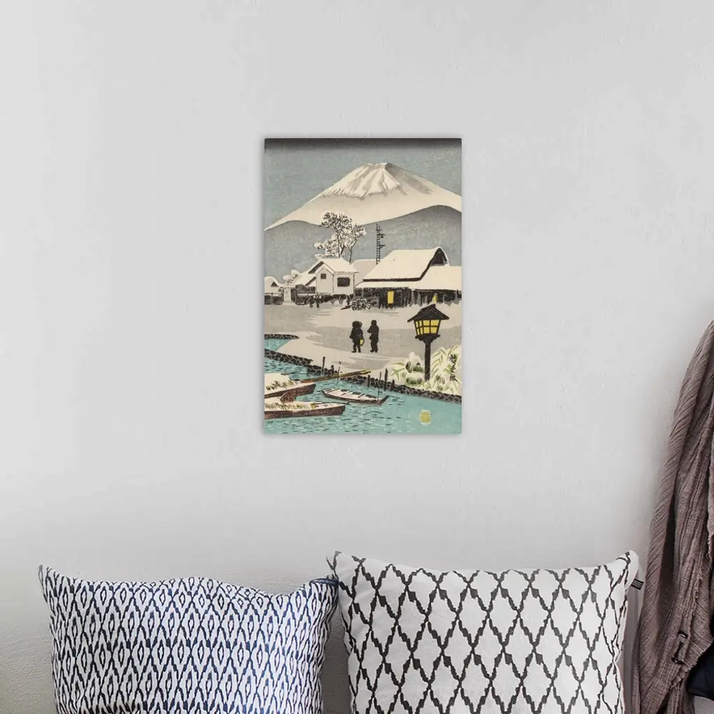 Eastern art of snowy village scene with Mount Fuji in the background.