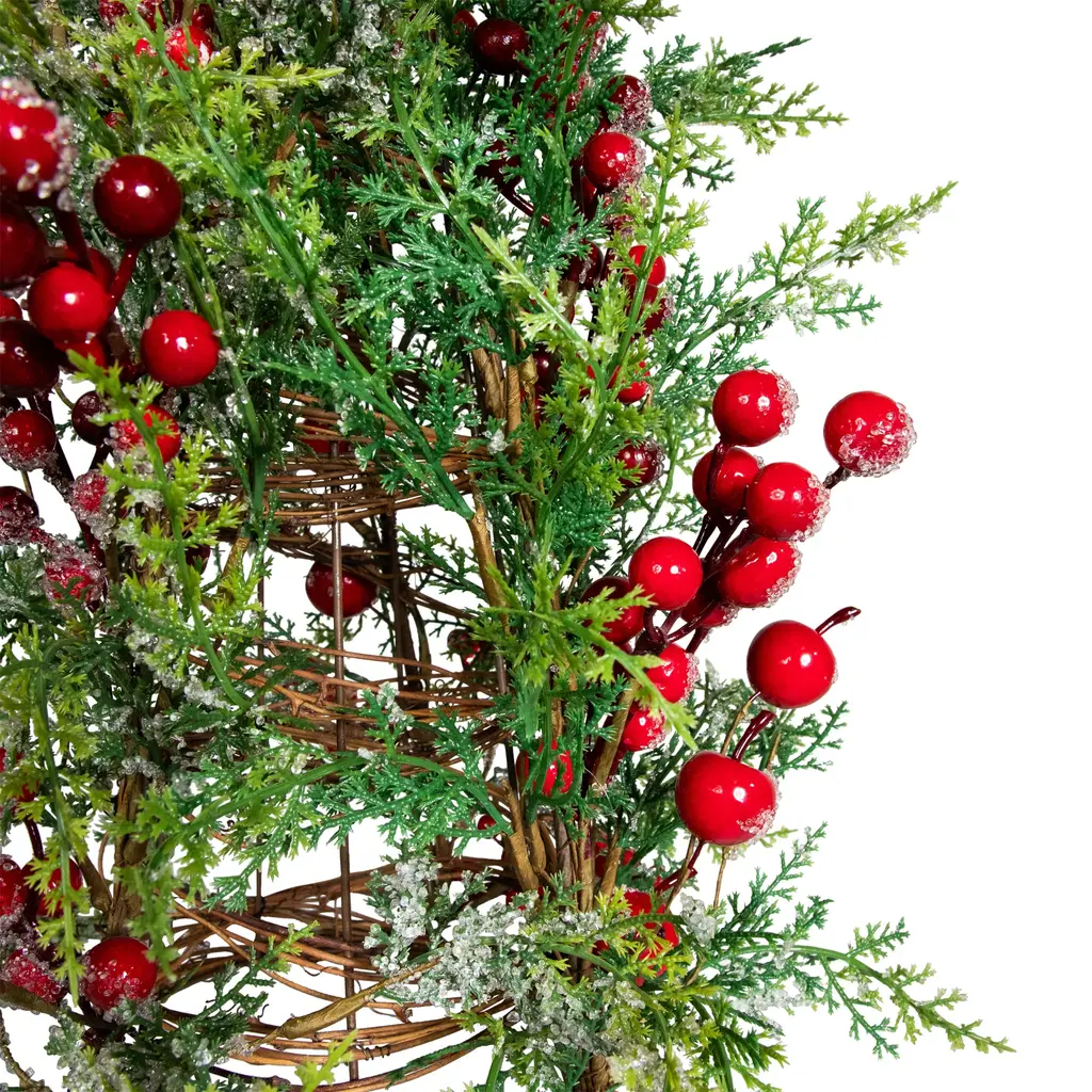 This Christmas cone tree brings a touch of winter magic to your holiday decor. Crafted with a natural twig cone, it features a festive arrangement of pine and red berries, while glittered clear beads add a frosty, icy shimmer. Perfect for creating a cozy, wintry atmosphere, this piece blends rustic charm with a hint of sparkle. Product Features: Christmas tabletop cone tree Showcases a twig cone base Decorated with red berries Accented with clear glittered beads for a frosted ice look For indoor use only Dimensions: 25" high x 17" diameter Material(s): PVC/PE/plastic/foam