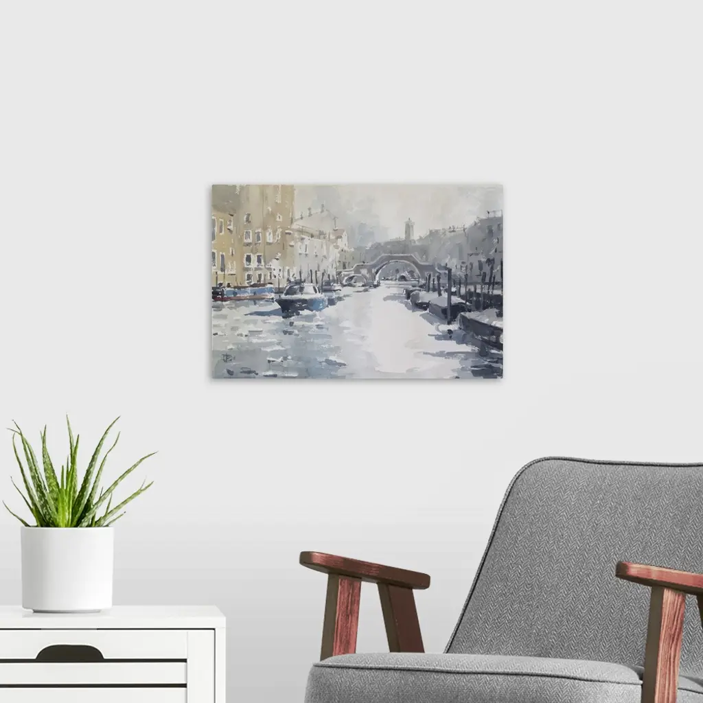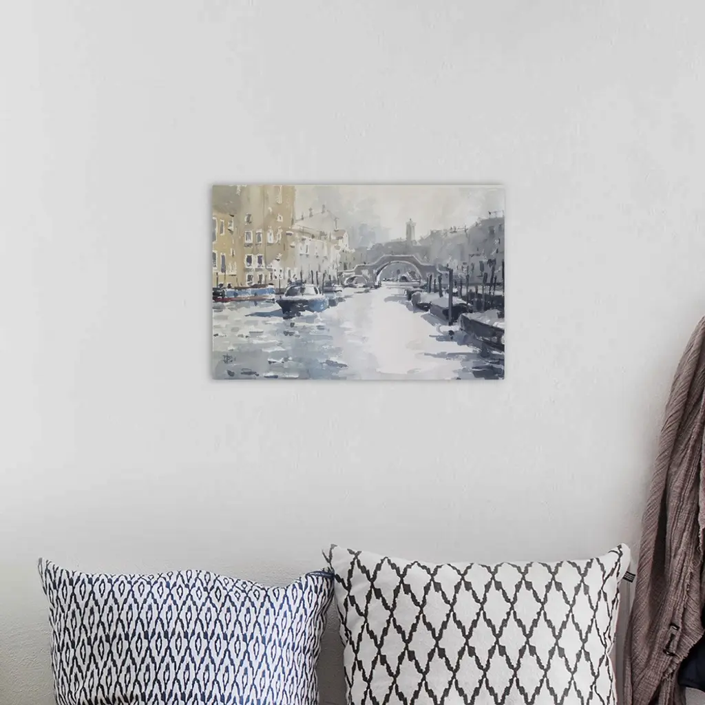 Soft watercolor brush strokes with pops of blue create a water landscape of the Three Arches Bridge in Venice on a cold winter day.