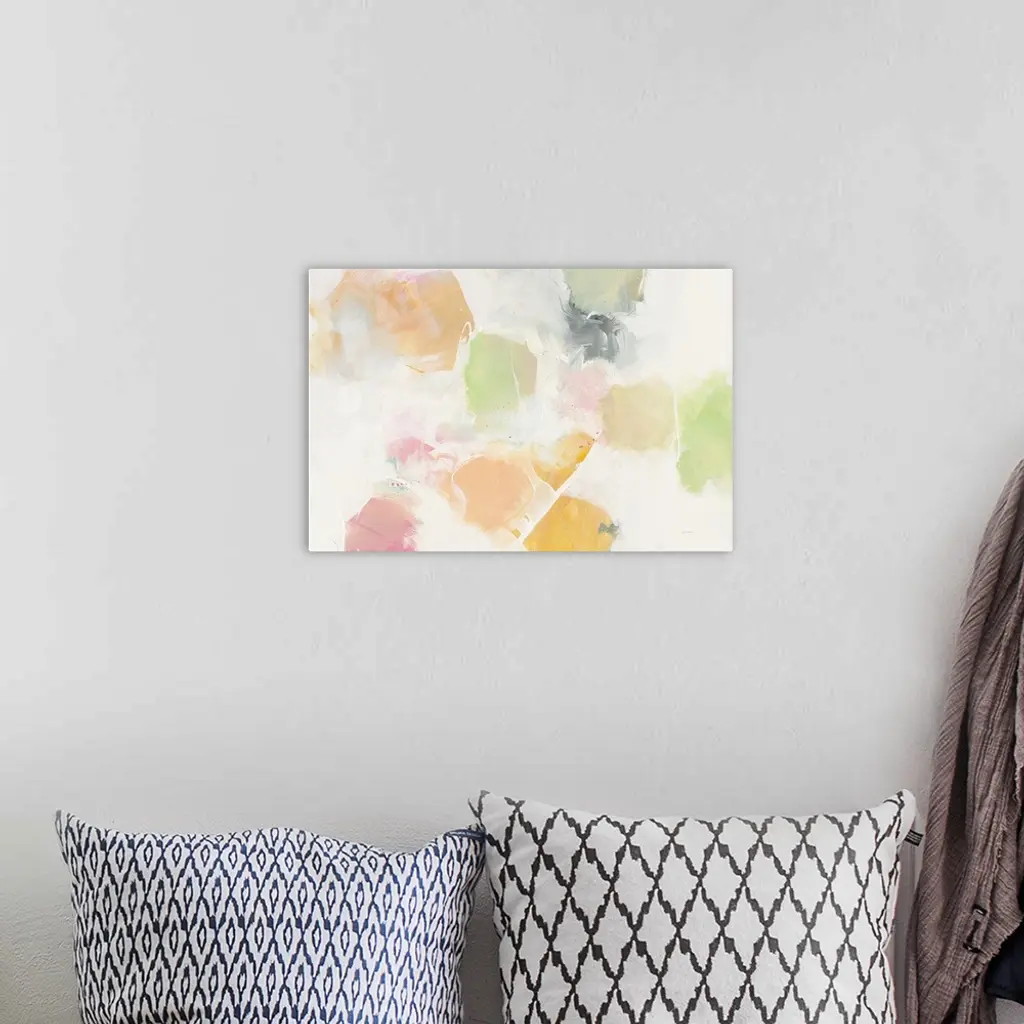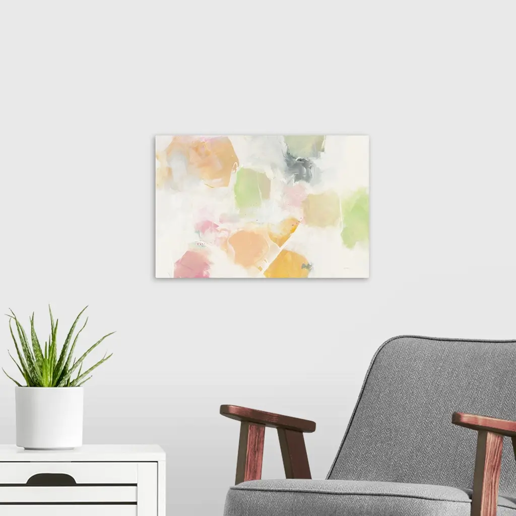 Large abstract art with soft blotches of green, pink, orange, and yellow hues on a grey and white background.