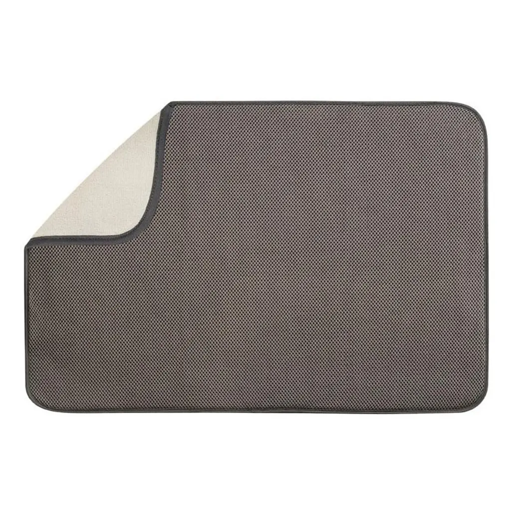 The InterDesign Dry mat is an absorbent kitchen companion that catches drips from underneath your dish rack, keeps your counter from being scratched and cushions your stemware and dishes. The patented technology uses mesh and microfiber terry for speedy drying. Pewter top color with ivory underneath.