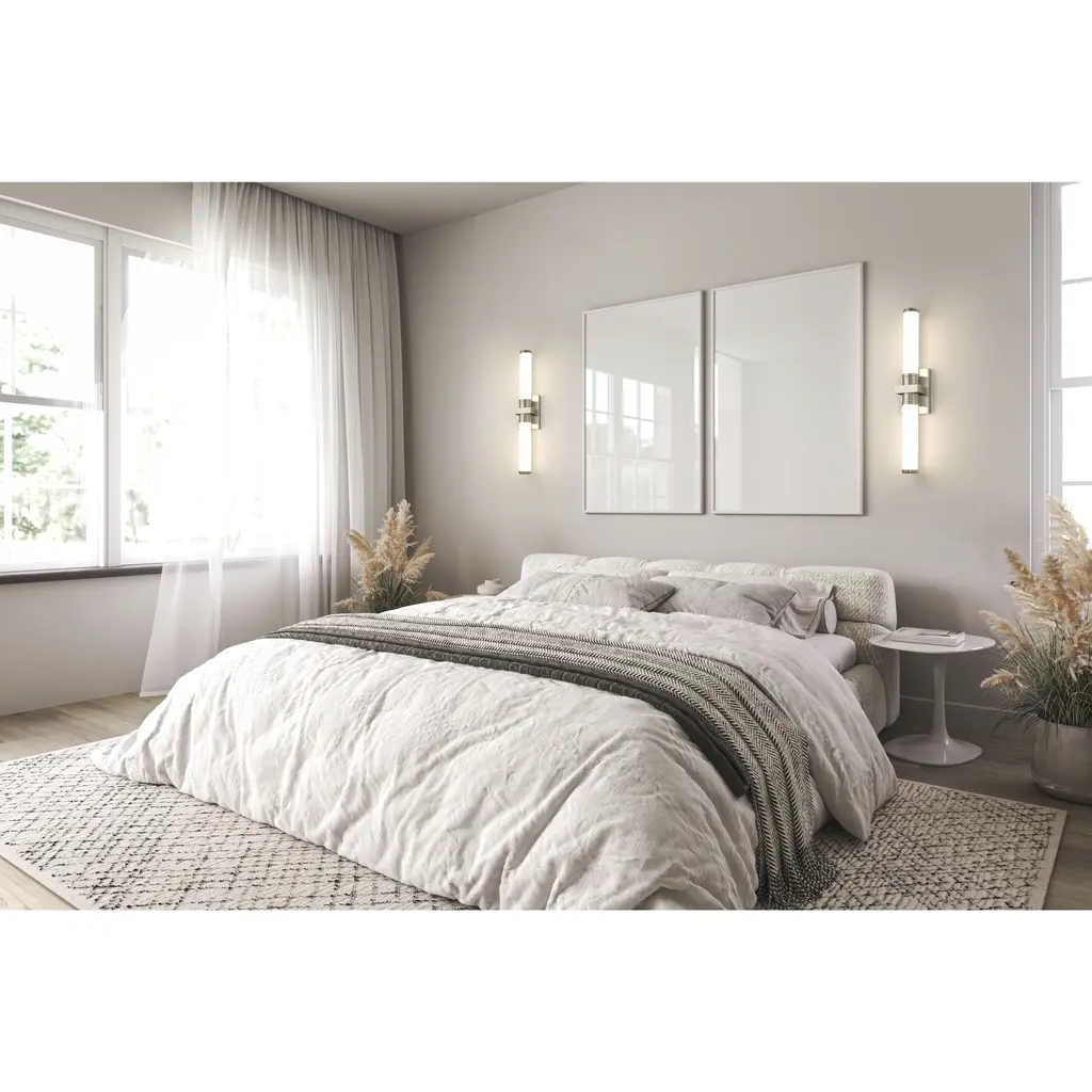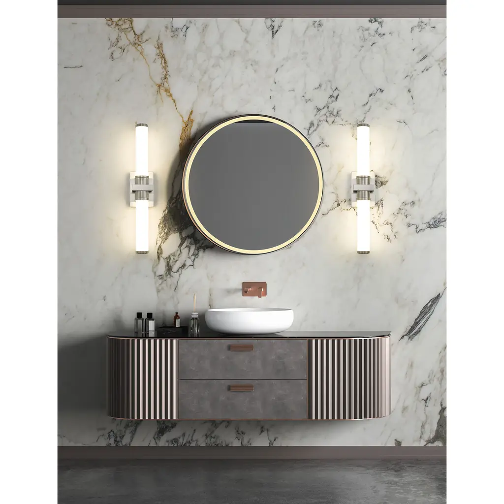 A square cuff adds decorative flair to the clean lines of this modern LED vanity bath light. Its brushed nickel finish complements in virtually any space, while cylindrical opal glass shades diffuse lighting to create a soft glow. The LED light is dimmable and energy efficient to bring your home into the 21st century in both style and technology.