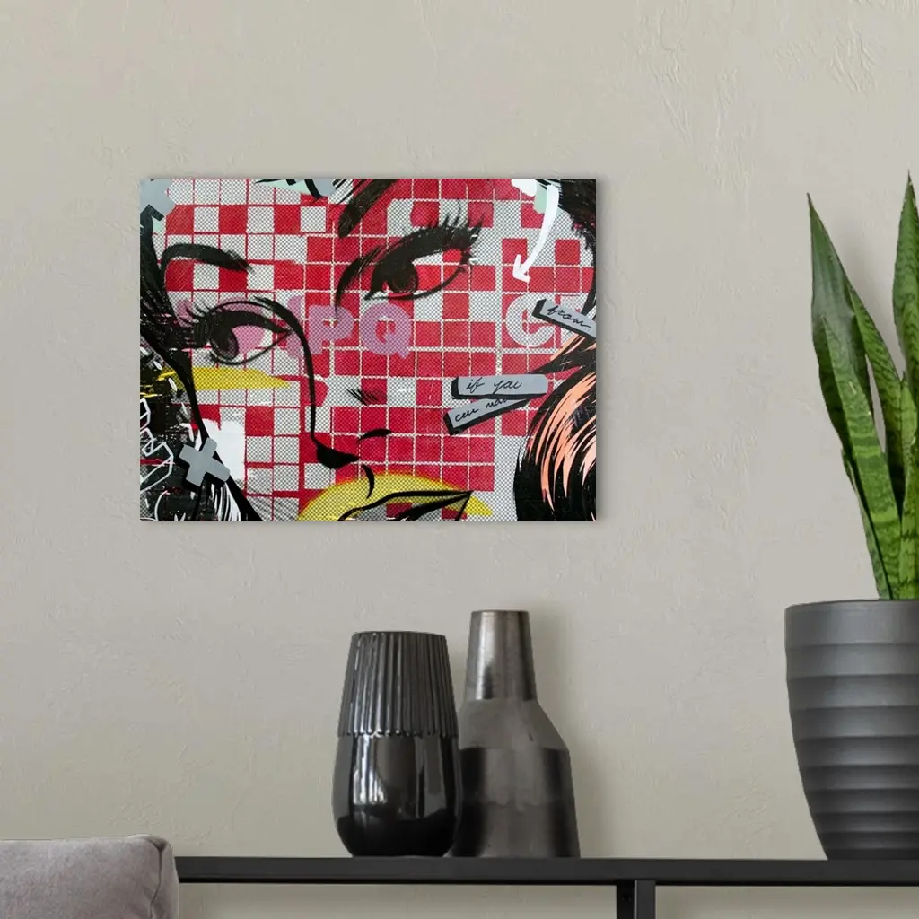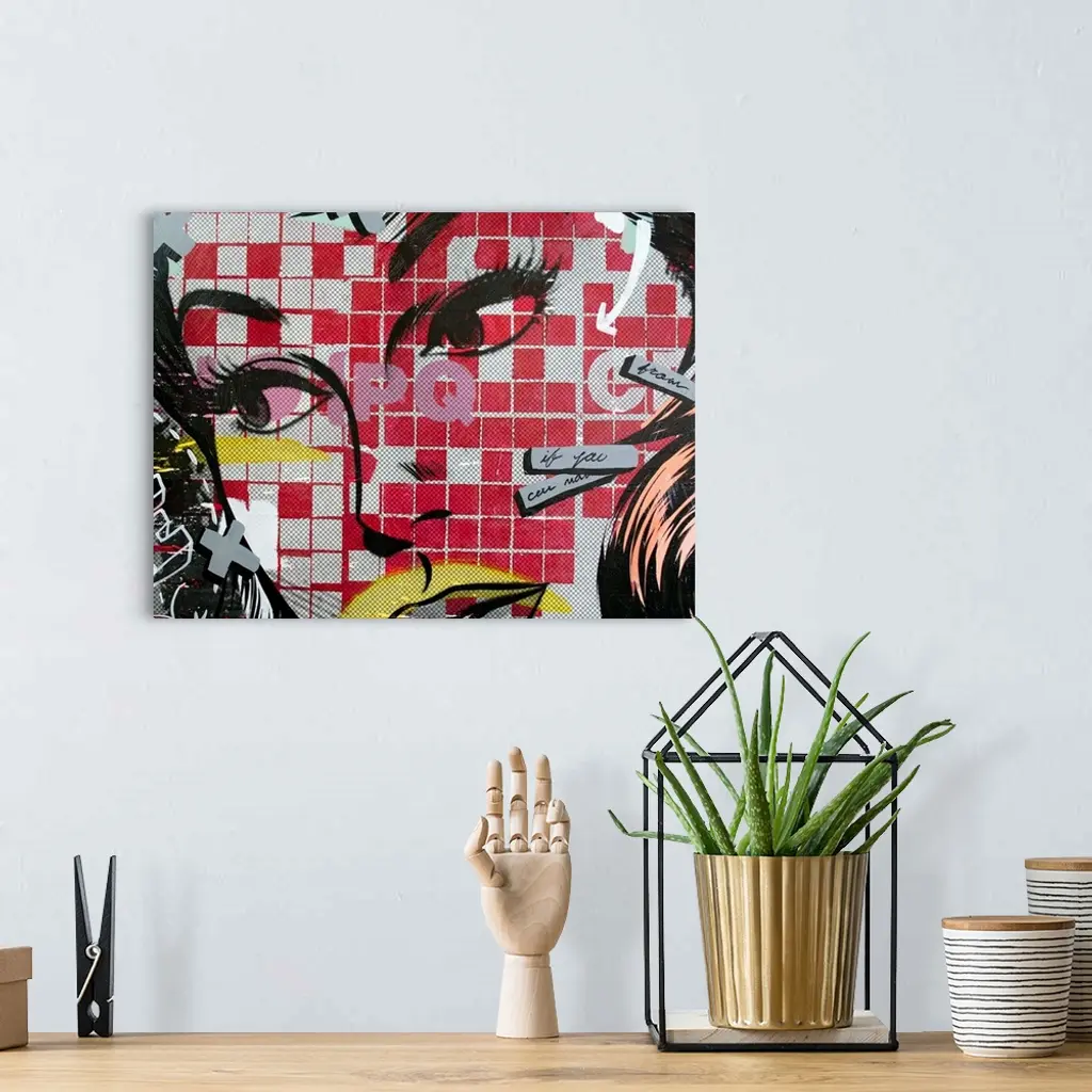 Pop art composed of comic illustrations and bold text, reminiscent of Lichtenstein, of a close-up of a woman's face with red tiles.