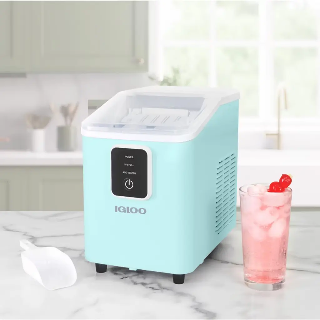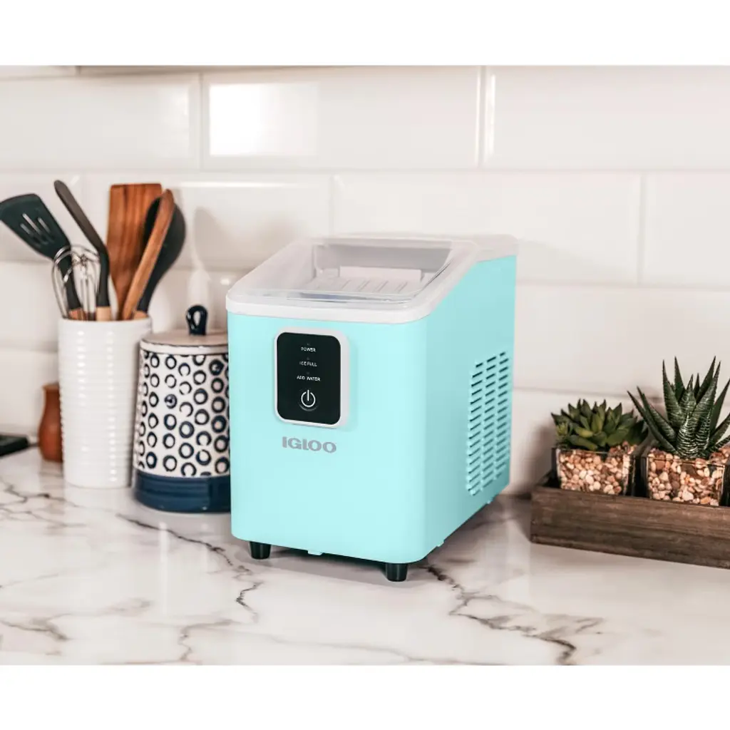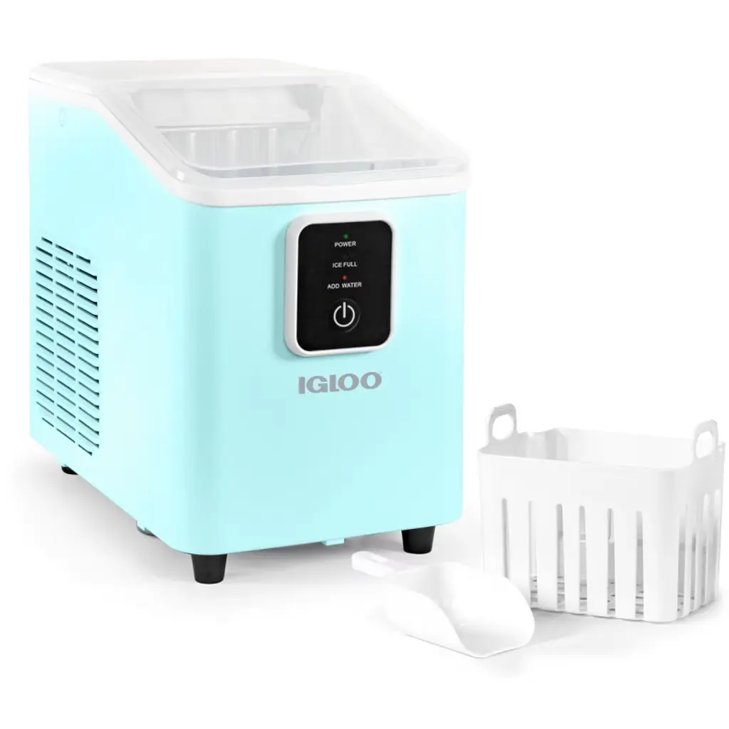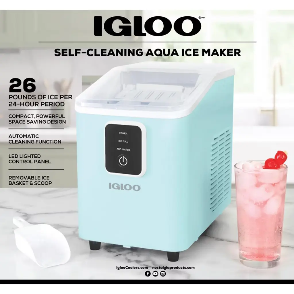 Meet the Igloo Self-Cleaning Countertop Ice Maker, your stylish and portable solution for keeping beverages perfectly chilled! In 7 minutes, you'll have your first batch of ice ready, and in a full day you can make up to 26 lbs. of ice. With a design that's sleek yet compact, you will save a ton of extra counterspace while still producing plenty of ice for keeping drinks cool. Operation is simple with a single-button control panel with LED indicator lights that signal when ice is full or water is needed. The included 1-pound ice basket and ice scoop ensures easy ice serving. The automatic five-cycle self-cleaning function makes clean up easy and allows clean ice to be made every time. Perfect for pool parties, home bars, dorm rooms, offices and more! Cold Drinks. Warm Smiles.