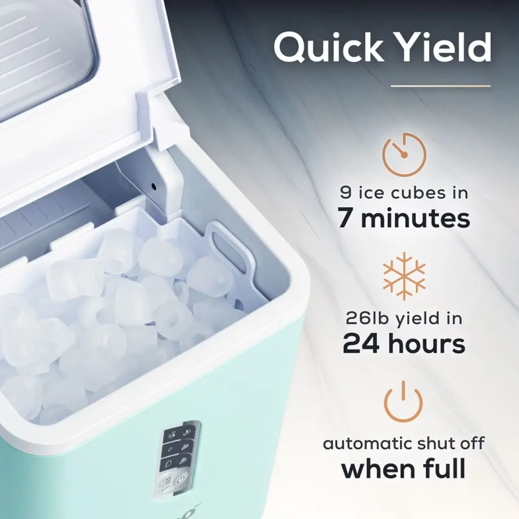 This stylish and portable ice maker allows you to make ice accessible almost anywhere you need it. With its intuitive, easy-to-use design, you'll be making ice cubes soon after you plug in your new appliance. It can make 9 cubes, large or small, in almost 7 minutes. Perfect for kitchens, RVs, club houses, home bars, and more.