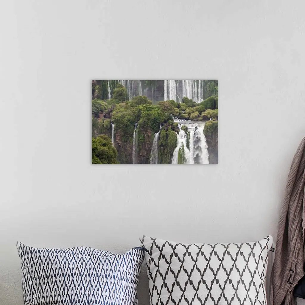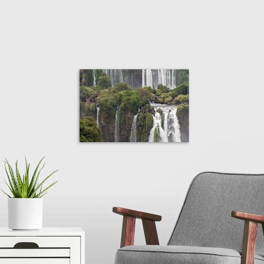 Photograph of massive waterfalls flowing down over lush jungle cliffs.