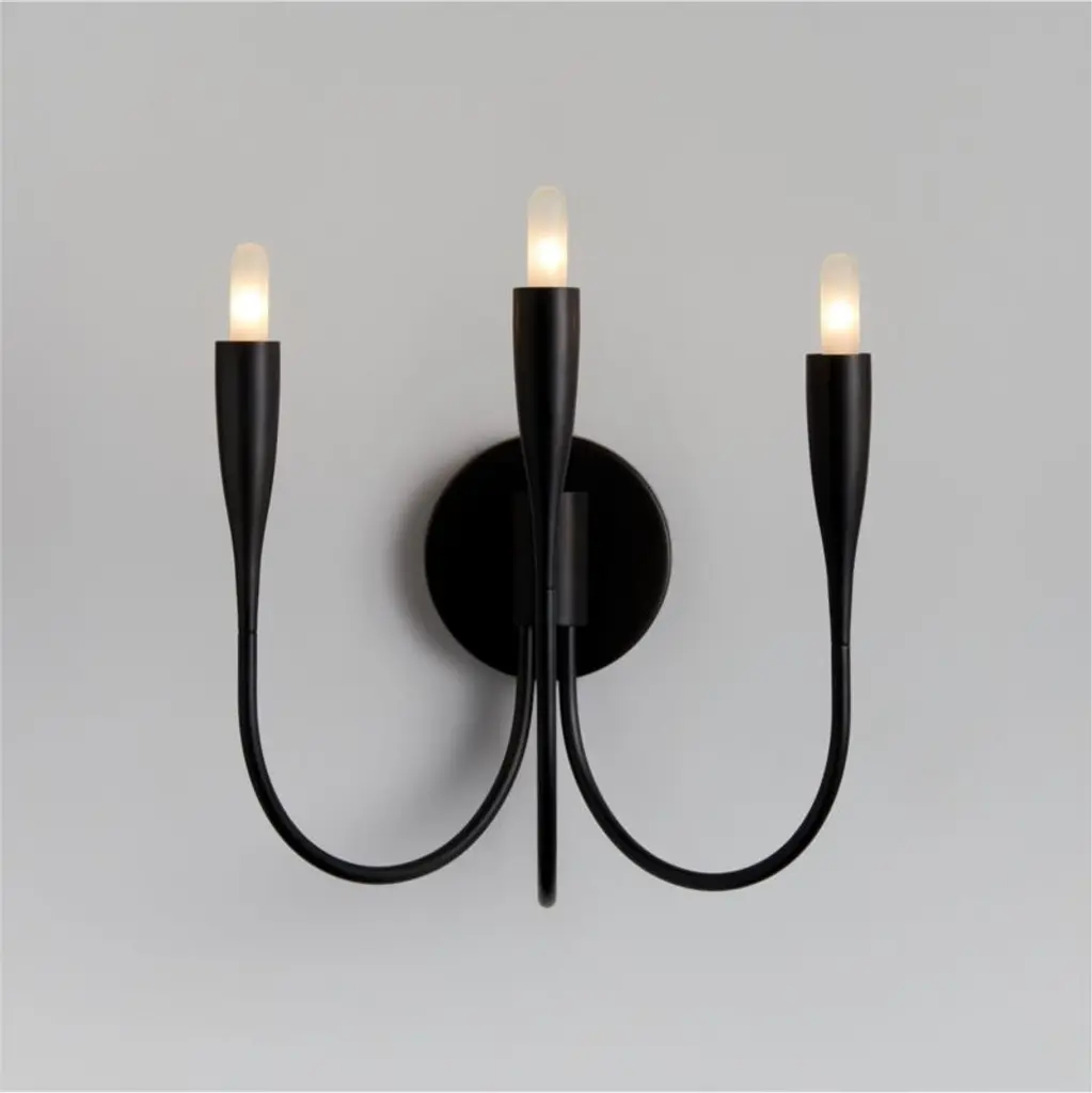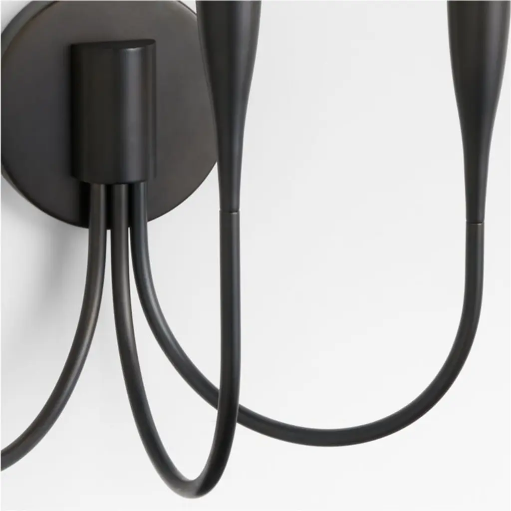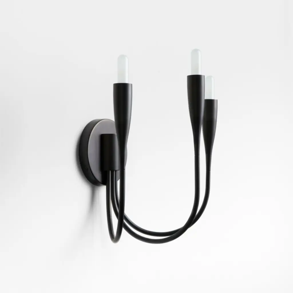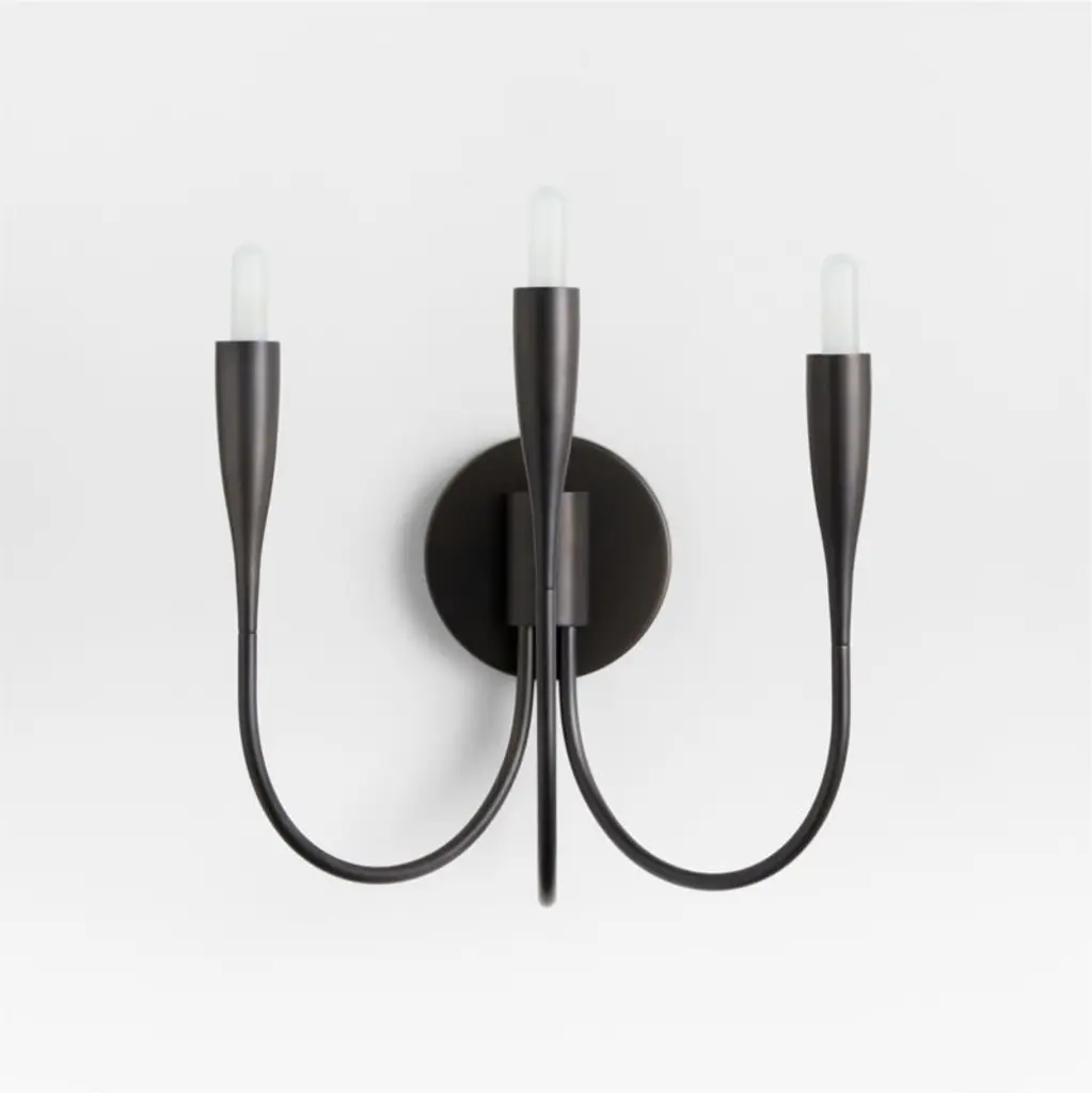 This lithe sconce makes a big impact. Three arms swoop from the wall plate, with the center arm arcing just a bit higher to create a subtle tiered effect. The blackened steel finish keeps the look clean and modern, with all the focus on the graceful curves and your favorite candelabra bulbs. We love Iiona flanking a buffet, lining a long hallway or serving as dramatic bedside lighting.
