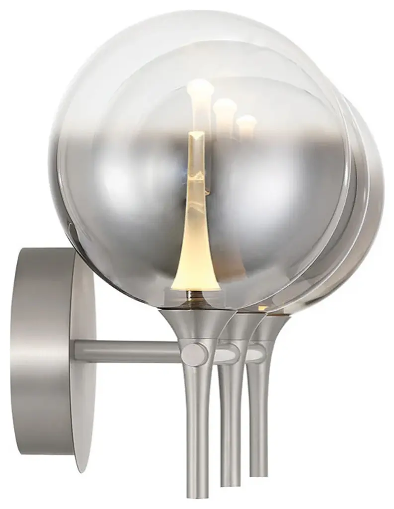 A modern 3-light vanity light featuring a sleek satin nickel finish and smoked glass shades, perfect for contemporary bathrooms and spaces needing soft, ambient illumination. This product is cETLus certified.•Number of Lights: 3•Bulb Type: LED integrated•Wattage: 12W•LED Color Temperature (K): 3000K•Dimmable: Yes•Bulb Included: Yes•Voltage: 120V•Hardwire or Plug-in: Hardwired