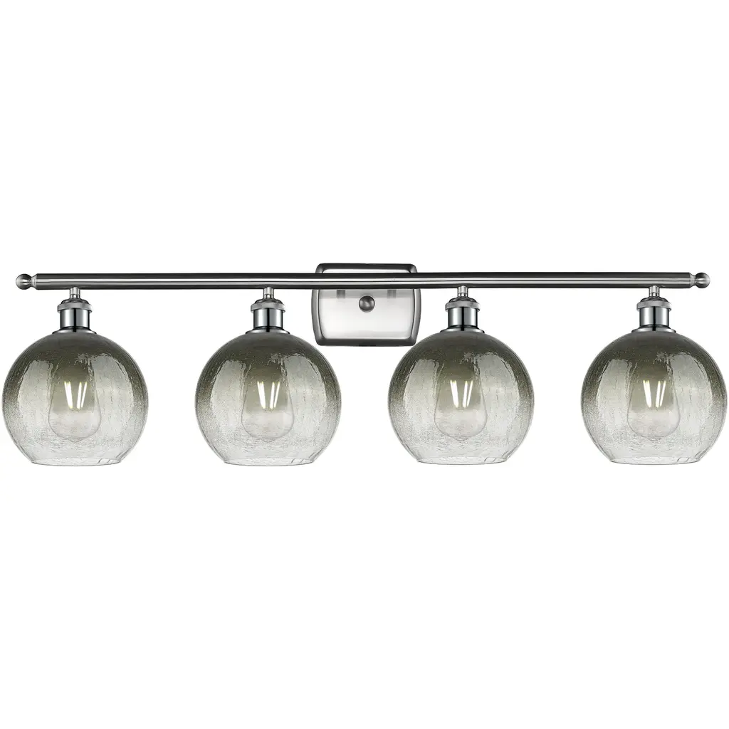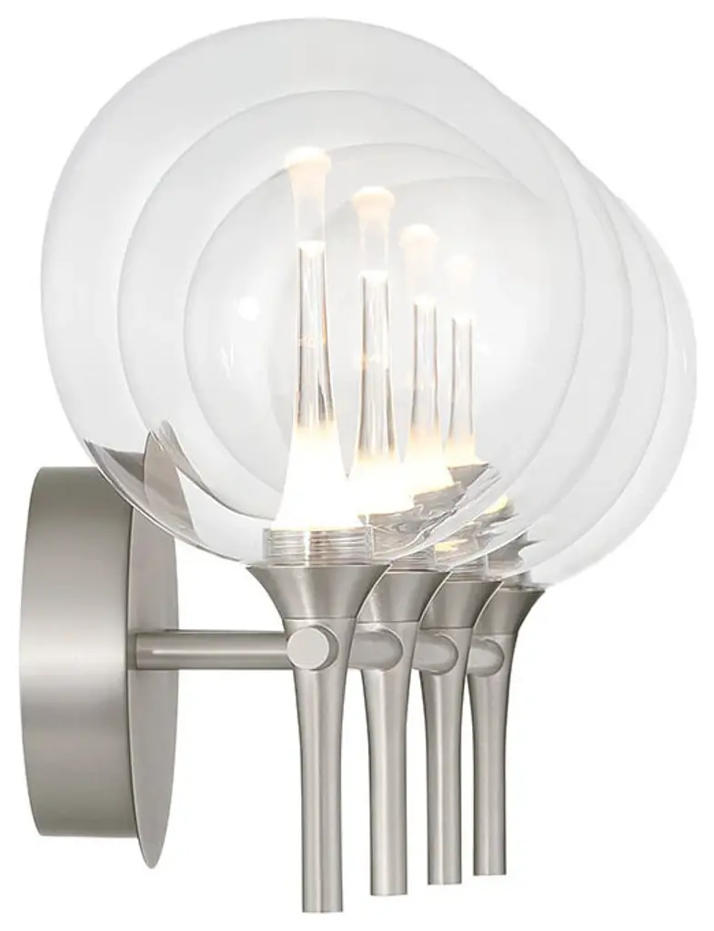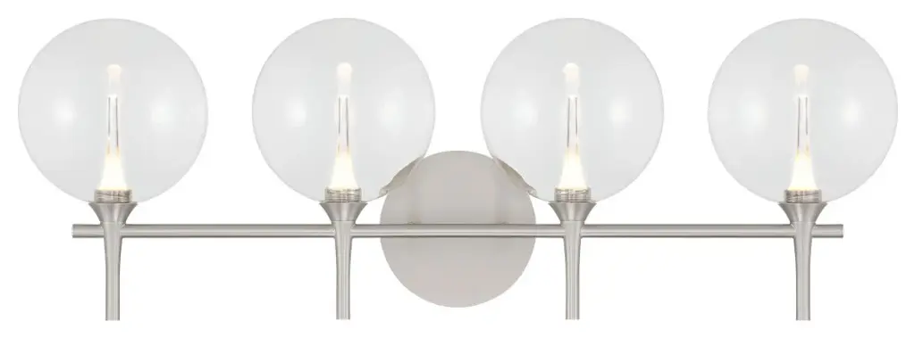 A sleek and stylish wall-mounted vanity light featuring a satin nickel finish and clear glass shades. This fixture offers a modern touch to your bathroom with its efficient LED lighting and clean design. This product is cETLus certified.•Number of Lights: 4•Bulb Type: LED integrated•Wattage: 16W•LED Color Temperature (K): 3000K•Dimmable: Yes•Bulb Included: Yes•Voltage: 120V•Hardwire or Plug-in: Hardwired