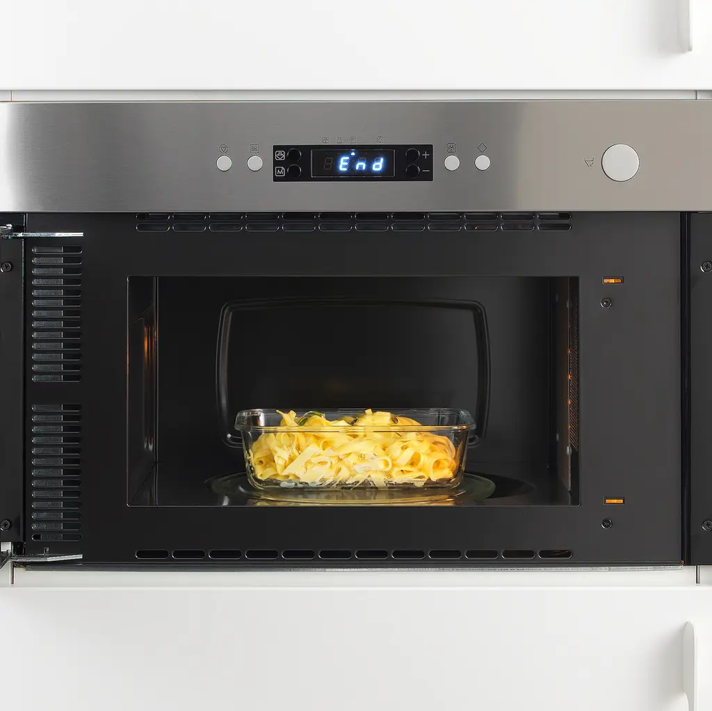 IKEA 365+ Food container - rectangular/glass 34 oz. The food container is made of oven-safe glass and can be used as an oven/serving dish. Made of glass, which does not absorb odors or discolor from tomato sauce, etc, so the food container is easy to clean. Suitable for use with an air fryer.