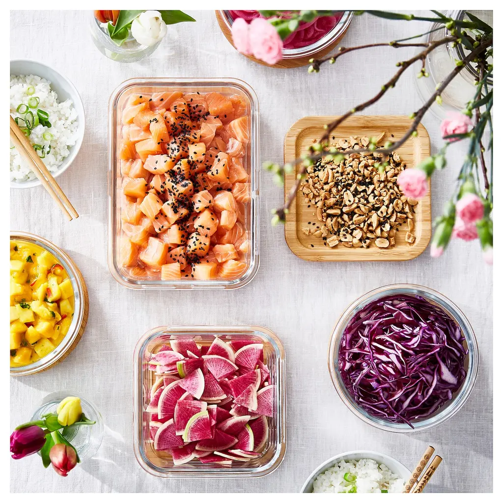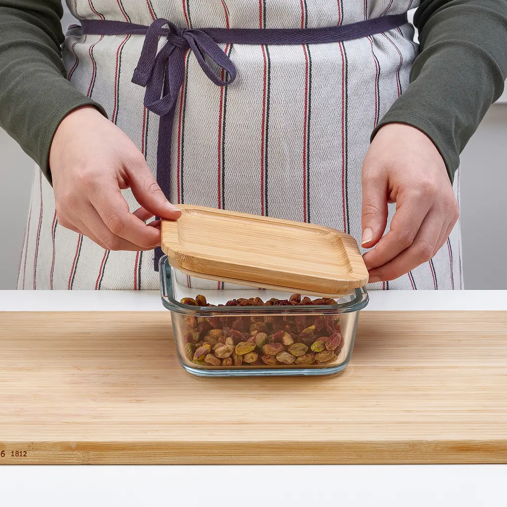 IKEA 365+ Food container with lid - square glass/bamboo 20 oz. Tight-fitting lid which keeps food fresh and preserves aromas and flavors. The natural bamboo creates a warm and vibrant look. The food container is made of oven-safe glass and can be used as an oven/serving dish.