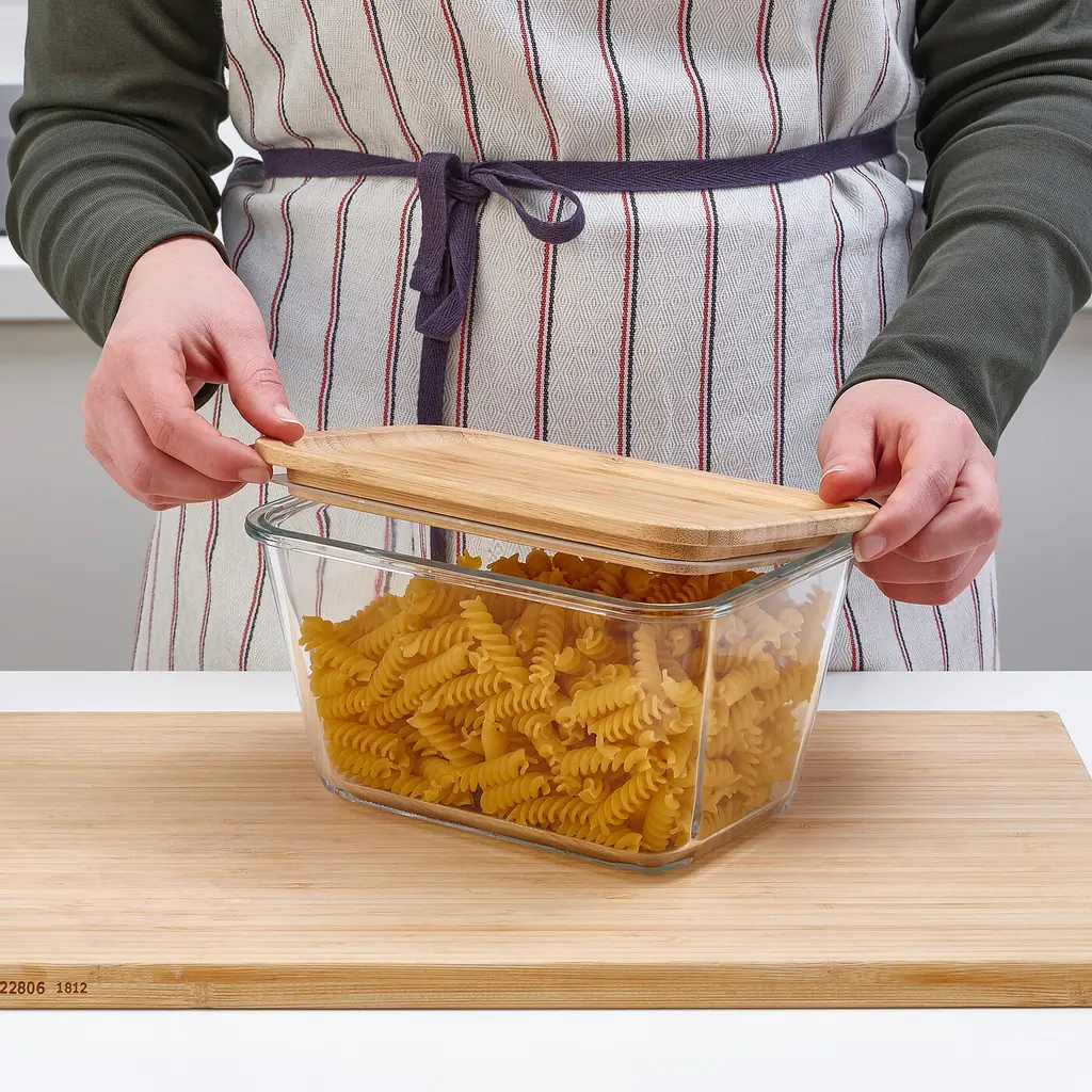 IKEA 365+ Food container with lid - rectangular glass/bamboo 61 oz. Tight-fitting lid which keeps food fresh and preserves aromas and flavors. The natural bamboo creates a warm and vibrant look. The food container is made of oven-safe glass and can be used as an oven/serving dish.